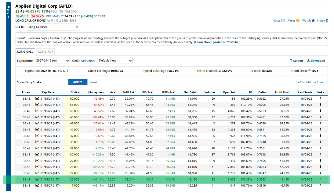 According to the options chain, you can buy a 20-strike long call on APLD that expires on January 15, 2027. This trade costs $21.20 per share or $2,120 per contract. Your breakeven price will be $41.20, and the trade has a delta of 85.