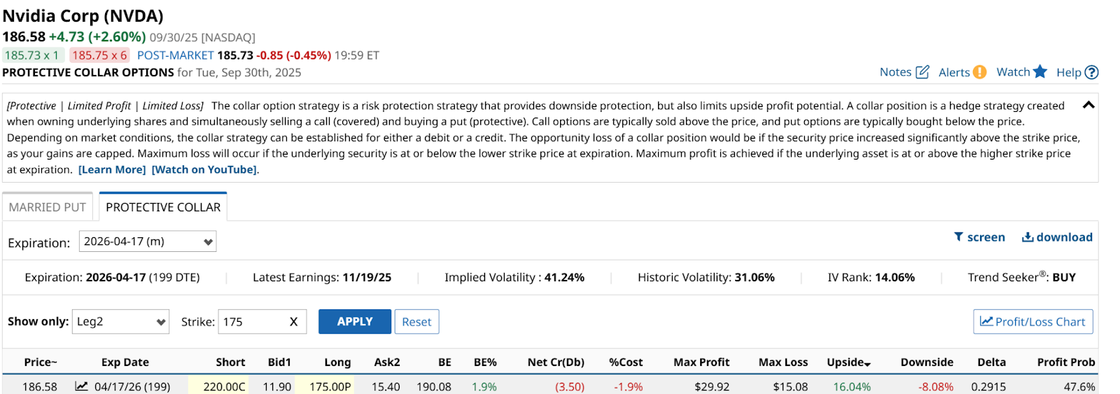 We can collar anything we want, as long as we can foot the bill for owning 100 shares of the underlying stock. In the case of NVDA, that means holding about $18,650 worth of stock (100 shares) as of Tuesday’s close. Here’s a collar example that aims to capitalize on a possible 10% move toward $5 trillion, but protecting below that recent low around $165. Let’s see what the Barchart.com options tables point me to.