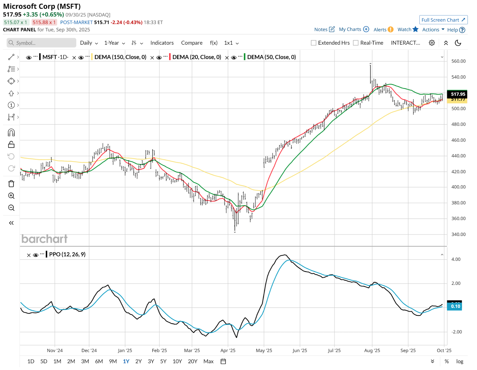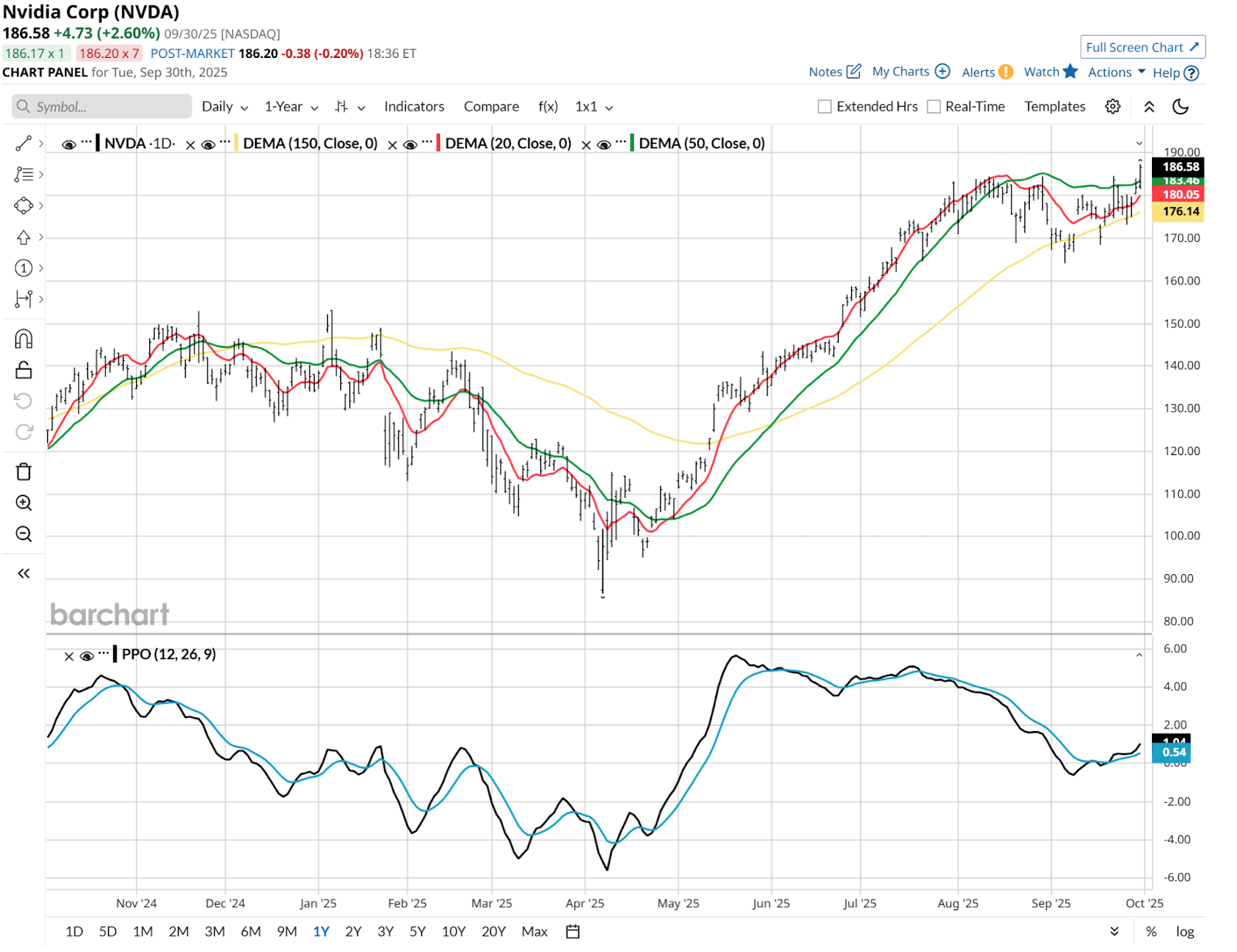 I see a stock doing its best to make a dash toward an even $5 trillion in market cap. That Percentage Price Oscillator (PPO) at the bottom section is crossing up nicely into positive territory. And the 20-day moving average up top in red is making a similar move. NVDA just hit another all-time high, and let’s face it, the broad market probably needs this stock to go up in order to continue this manic S&P 500 runup that began back in April.