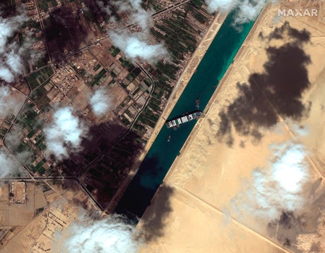 The Ever Given is wedged about 6 kilometers (3.7 miles) north of the canal's Red Sea entrance near the city of Suez.