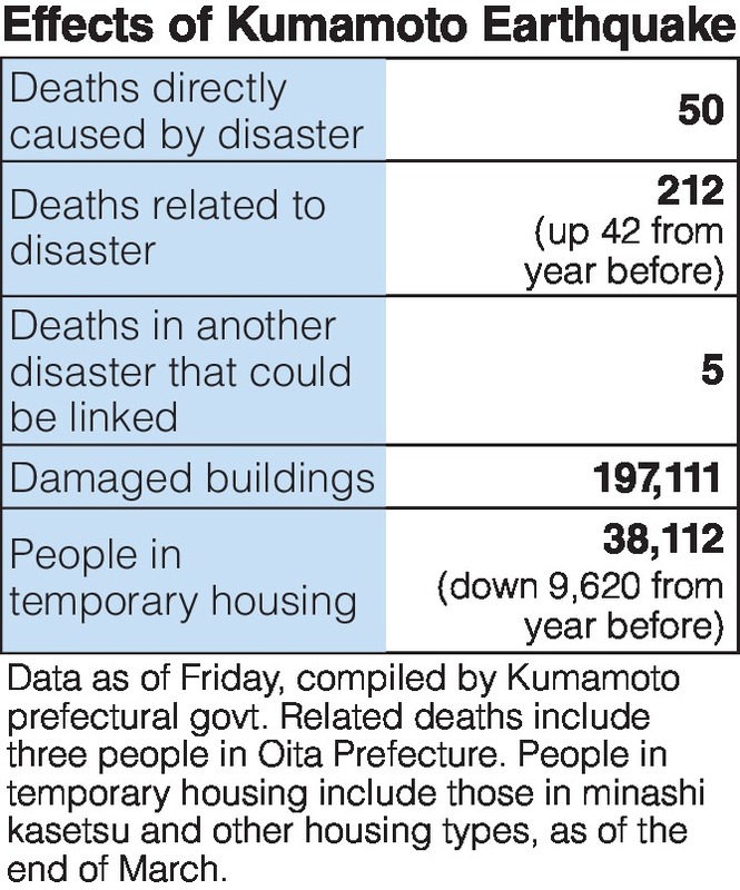 In Kumamoto Prefecture, 197,111 buildings were damaged in the series of quakes. That includes 8,648 homes that were totally destroyed.
