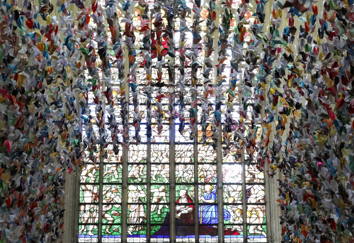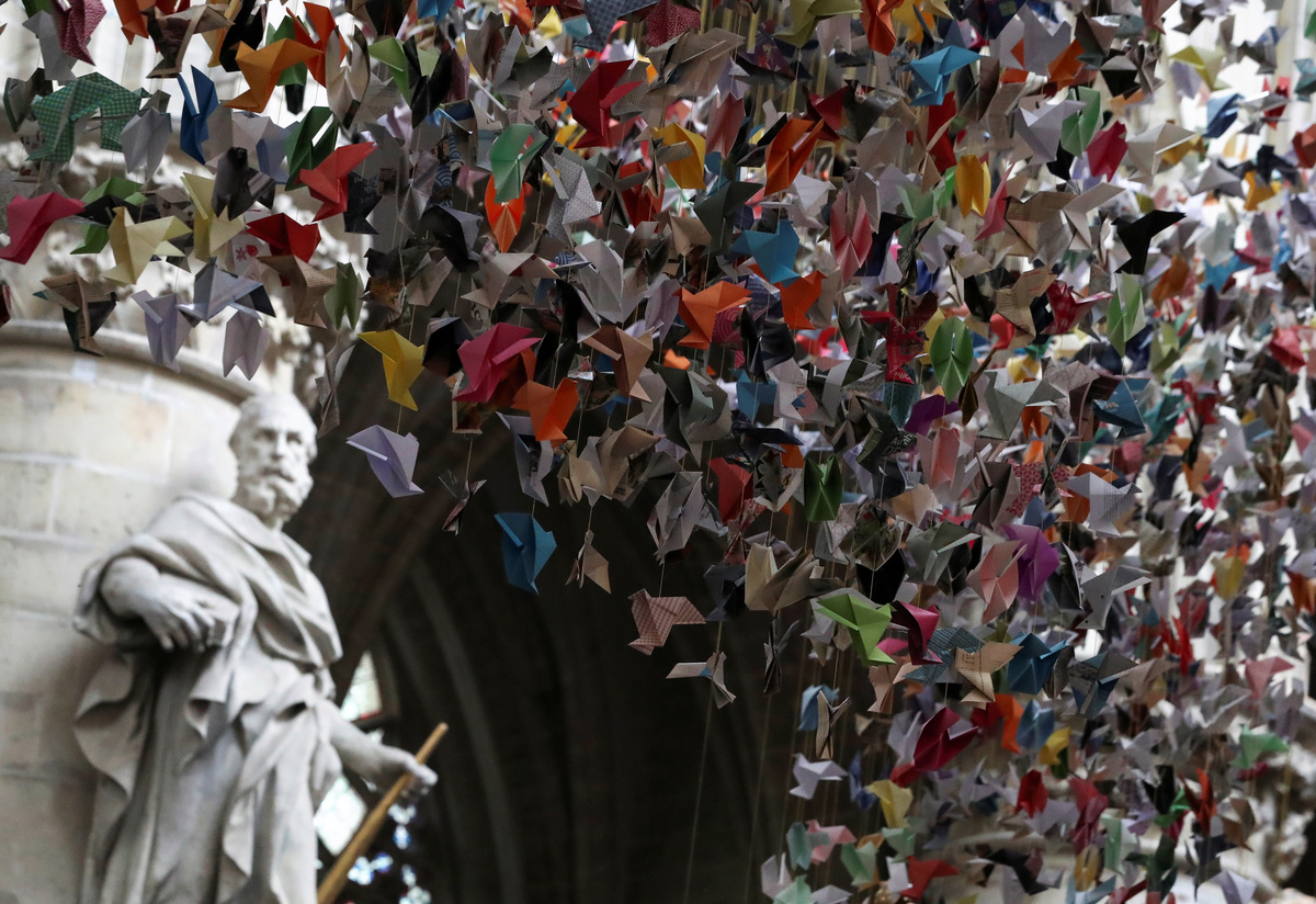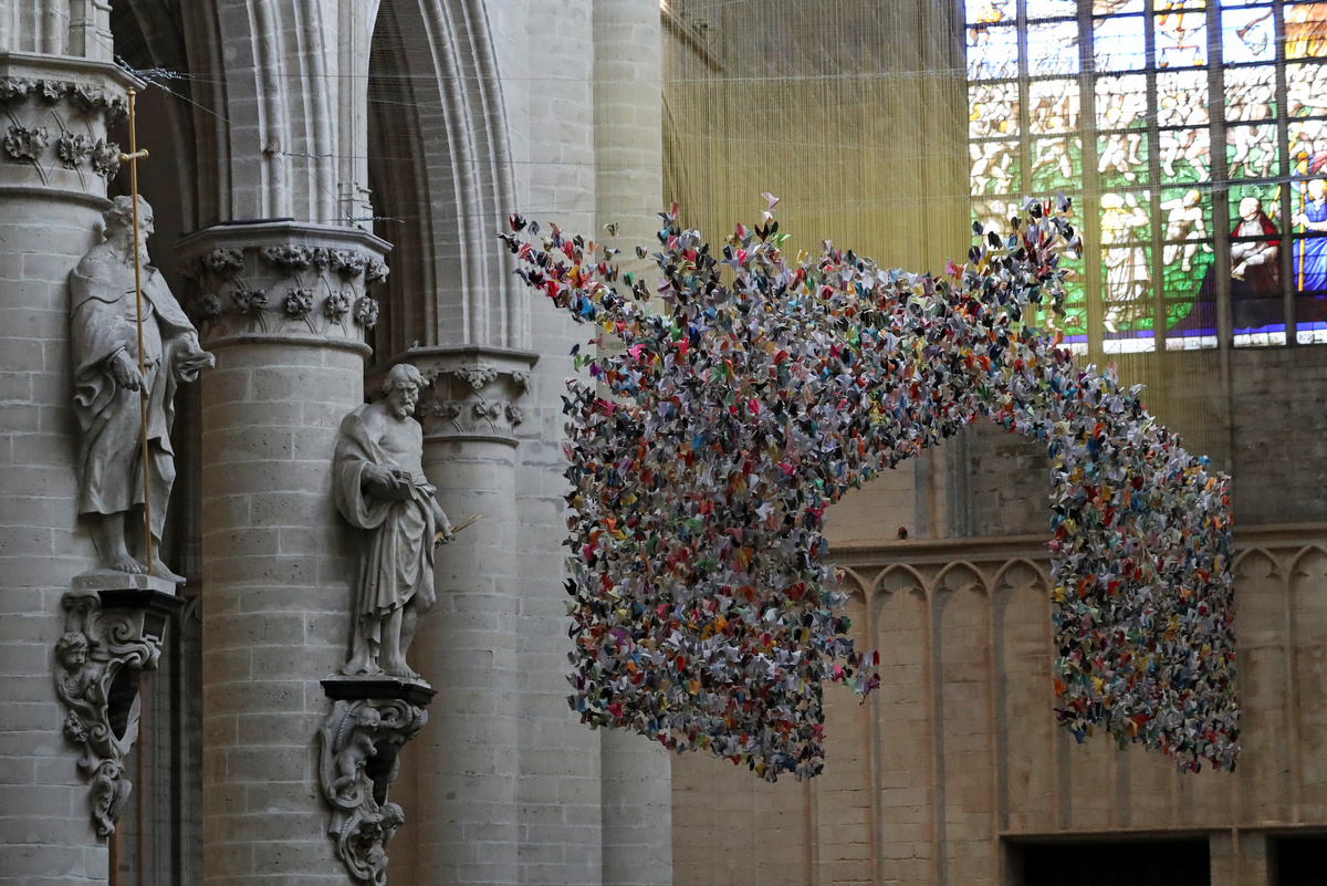 Suspended from the ceiling of the medieval Cathedral of Saint Michael and Saint Gudula by thin wires, the paper creations have come from as far afield as Hong Kong, New York and Tokyo, after Belgian designer Charles Kaisin asked people to send in home-made birds, or deposit them in boxes in 160 shops around Brussels.