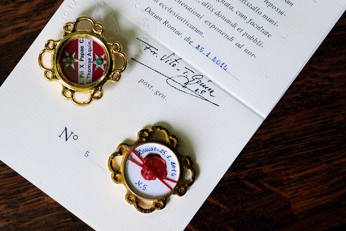 Adele Kenny explains how the system works: the relic sits behind a glass crystal with a handwritten label naming the saint, then everything gets tied down with thread and stamped with a red wax seal from the issuing Church authority.