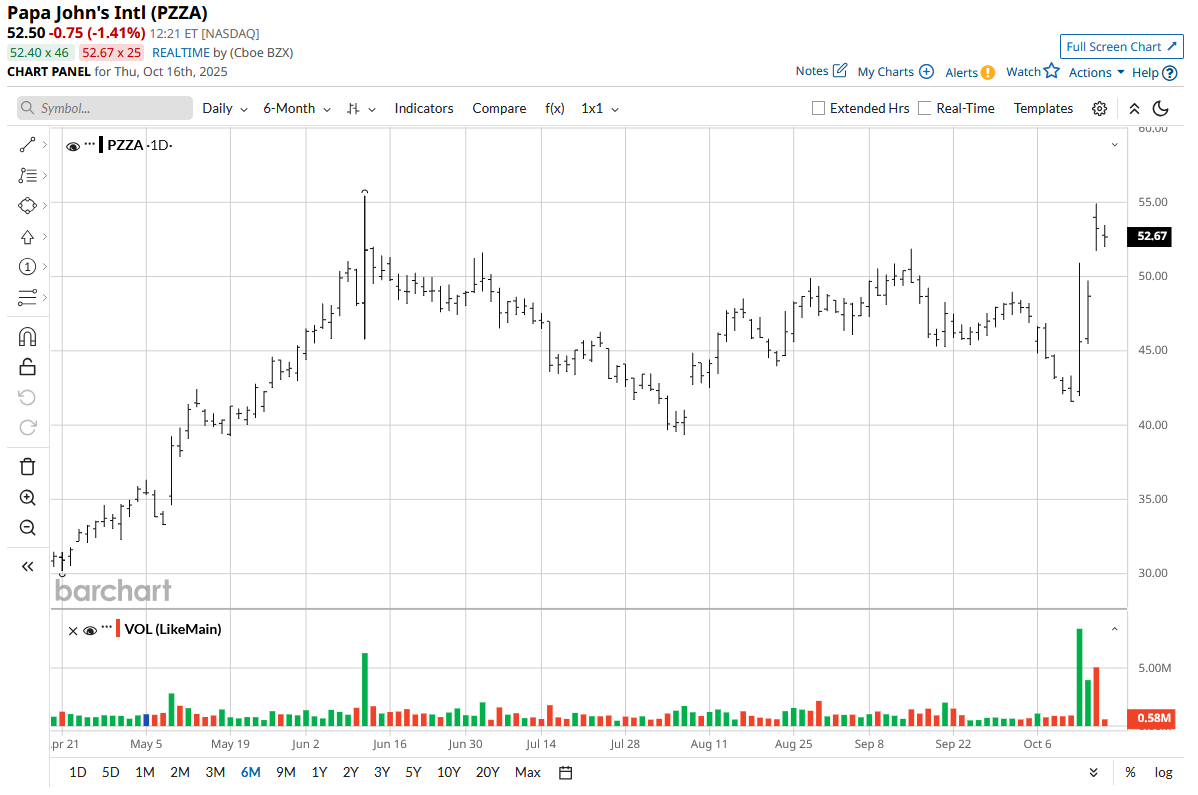 PZZA stock has seen dramatic stock movements in recent weeks. The stock gained 25% over the past five days, driven by upbeat earnings and optimism in food delivery trends. However, its 52-week return is down 2%, reflecting ongoing volatility and competitive pressures. For the last six months, Papa John’s shares have climbed 70%, while year-to-date (YTD) performance stands at 28%, outpacing the Nasdaq Composite’s ($NASX) 17%.