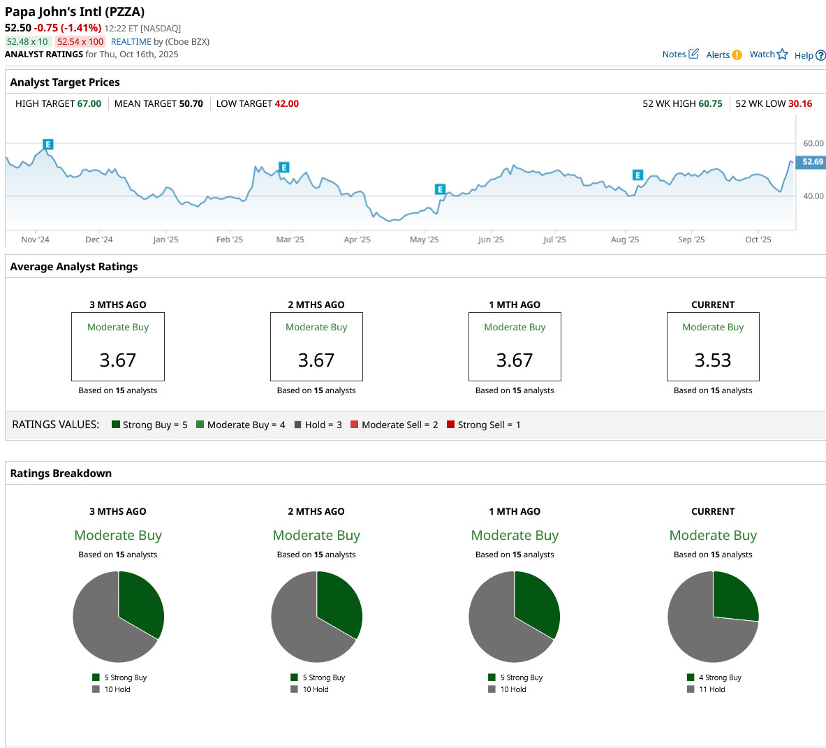 Papa John’s recent takeover speculation has left investors divided. While the reported $64 per share offer from Apollo Global Management implies an upside of about 20%, PZZA stock’s consensus rating remains a “Moderate Buy” with an average price target of $50.70, indicating potential downside from current market pricing.