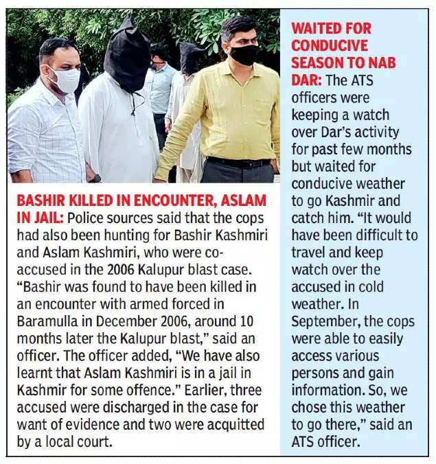 AHMEDABAD: The Gujarat Anti-terrorist squad (ATS) arrested an accused in the 2006 Kalupur railway blast case from his house in Dilna village of Baramulla district in Jammu and Kashmir, said DGP Ashish Bhatia on Thursday.