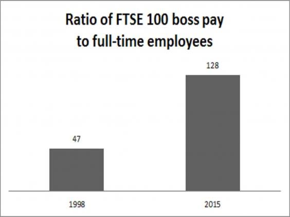 The ratio of the pay of the average FTSE 100 company boss is 128 times that of the average worker, up from just 47 times in 1998.