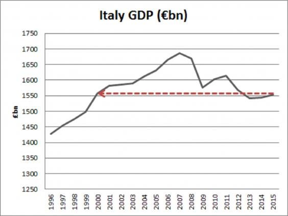 Italy, in particular, is a story of grand economic failure. The level of GDP in the economy is the same as it was in 2000. Youth unemployment is 36 per cent.