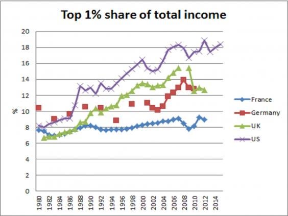 The share of total incomes going to the top 1 per cent of the population has been rising since the 1980s, particularly in the UK and the US.