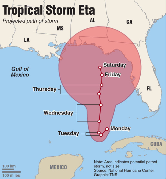 Eta is expected to strengthen again in the warm waters of the Gulf of Mexico with maximum sustained winds of 70 miles per hour, remaining just shy of hurricane.