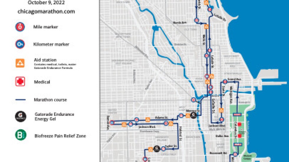 The start and finish line areas are in Grant Park on Columbus Drive. The course goes north to Sheridan Road, west to Damen Avenue and south to 35th Street.