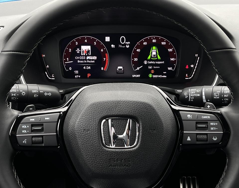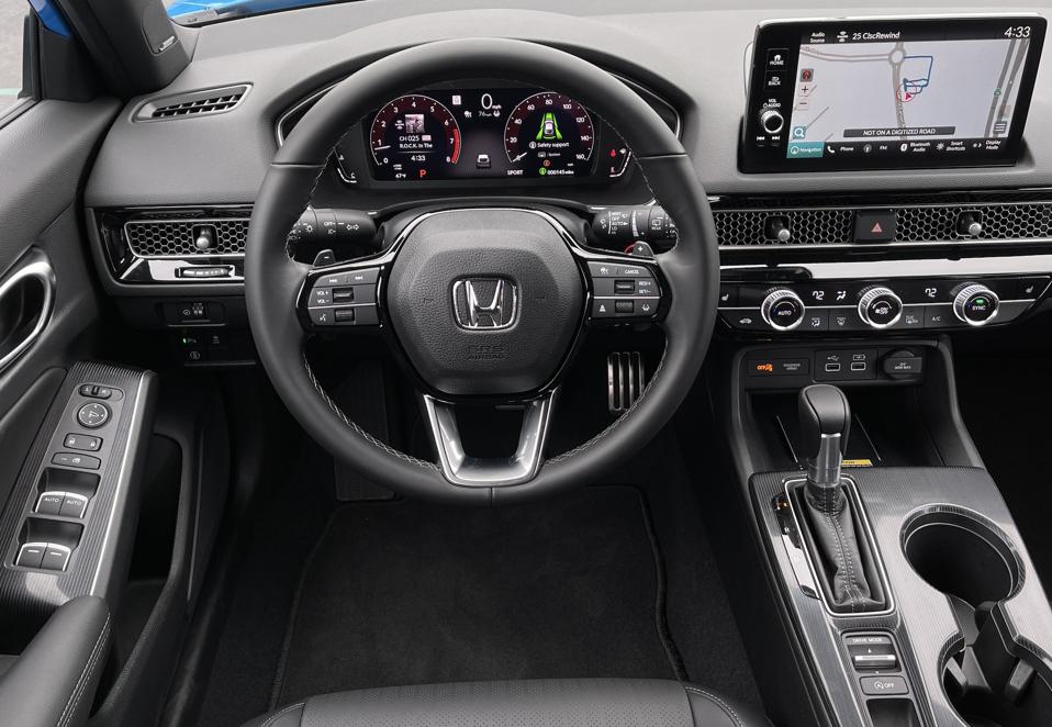 Beyond its compelling driving dynamics, the new 2022 Honda Civic boasts a wide range of advanced features. A new, standard 7-inch full color LCD gauge cluster can can be upgraded to a 10.2-inch cluster on top-line Sport Touring models. We really liked the clean, bright appearance of these new displays, and how the steering wheel controls corresponded to each primary gauge’s information (audio on the left, cruise control on the right). Similarly, the standard 7-inch central touchscreen monitor can be upgraded to a 9-inch display on Sport Touring models, and all models include Apple CarPlay and Android Auto (with wireless streaming and charging on Sport Touring trim). Sport Touring models also get a new 12-speaker Bose audio system.
