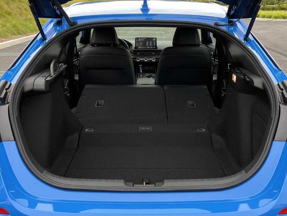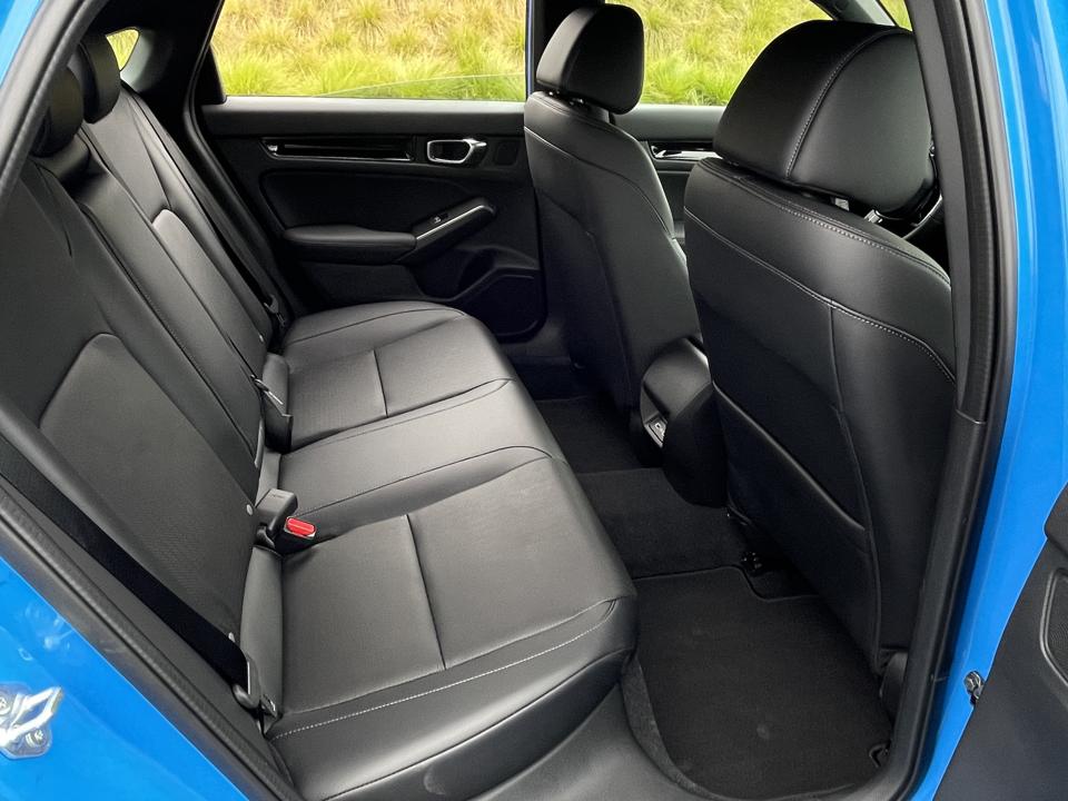 Rear seat space benefited from the new car’s longer wheelbase, with that 1.4-inch extension translating to 1.4 inches of increased legroom. The Civic rear seat uses “theatre style” elevation, with a seat bottom height slightly above the front seats. This combines with larger side windows and lower front fenders to improve outward visibility for rear passengers.