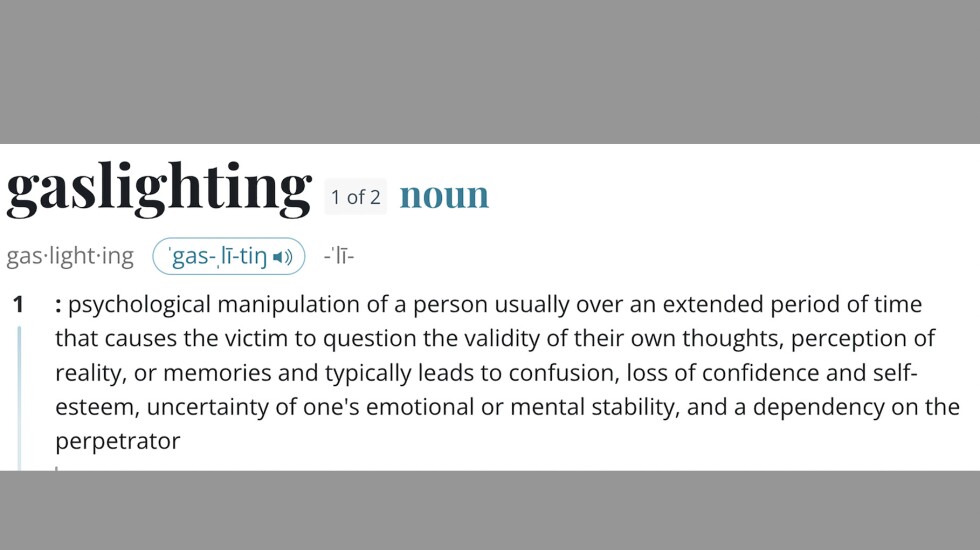 Merriam-Webster’s top definition for gaslighting is the psychological manipulation of a person, usually over an extended period of time, that “causes the victim to question the validity of their own thoughts, perception of reality, or memories and typically leads to confusion, loss of confidence and self-esteem, uncertainty of one’s emotional or mental stability, and a dependency on the perpetrator.”