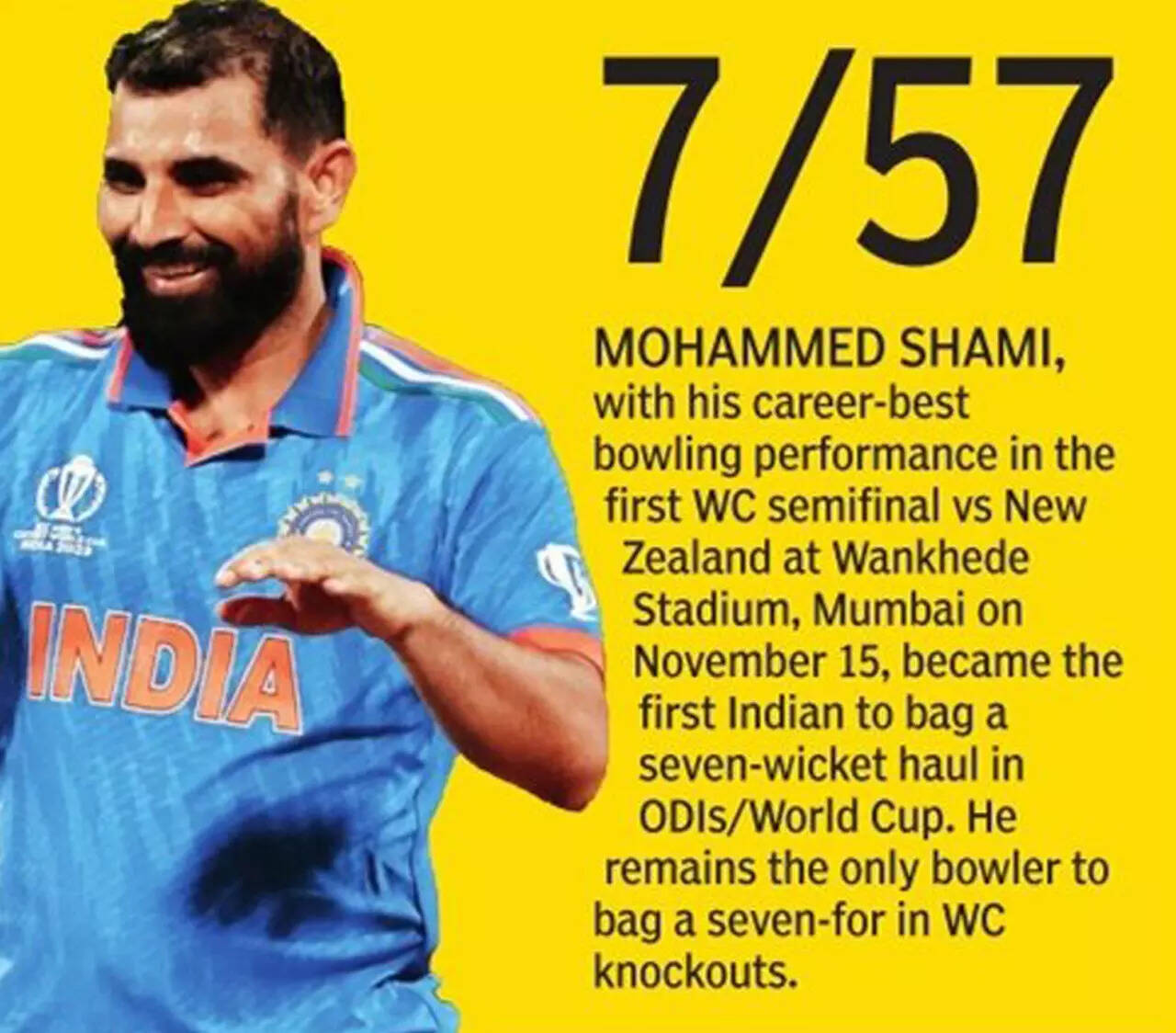 <p>With his career-best bowling performance of 7/57 in the first semifinal vs New Zealand on November 15, Mohammed Shami became the first Indian to bag a seven-wicket haul in ODIs/World Cup.</p>Getty Images5/10:World Cup record