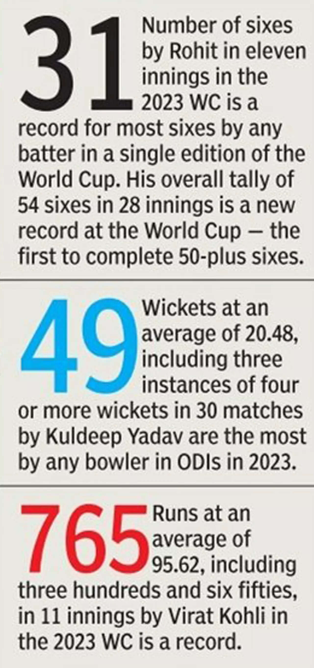 The same can be said about the skipper. Rohit was one of four Indian batters to log over 1000 ODI runs along with Shubman Gill (1584), Kohli (1377) and Rahul (1060) and his approach can best be established by the fact that he hit 67 of India's 250 ODI maximums in 2023 with 31 of them coming in the World Cup, a majority of those hits coming against top bowlers in the powerplay.