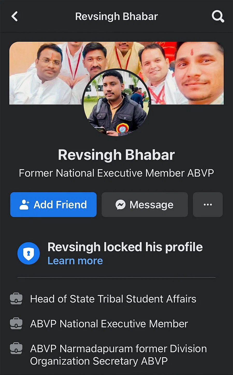 रेवसिंह भंवर को धार जिले में तिरला तहसील के ब्लॉक समन्वयक के रूप में सेवा देने के लिए चुना गया. वह एबीवीपी की राष्ट्रीय कार्यकारिणी के सदस्य थे और आरएसएस के स्वयंसेवक हैं. धार में नए नालचा तहसील ब्लॉक समन्वयक, जितेंद्र निनामा भी एक आरएसएस कार्यकर्ता हैं. धार में निसरपुर तहसील के ब्लॉक समन्वयक और आरएसएस से संबद्ध जनजाति विकास मंच के सदस्य, सचिन भंवर आरएसएस के स्वयंसेवक हैं.