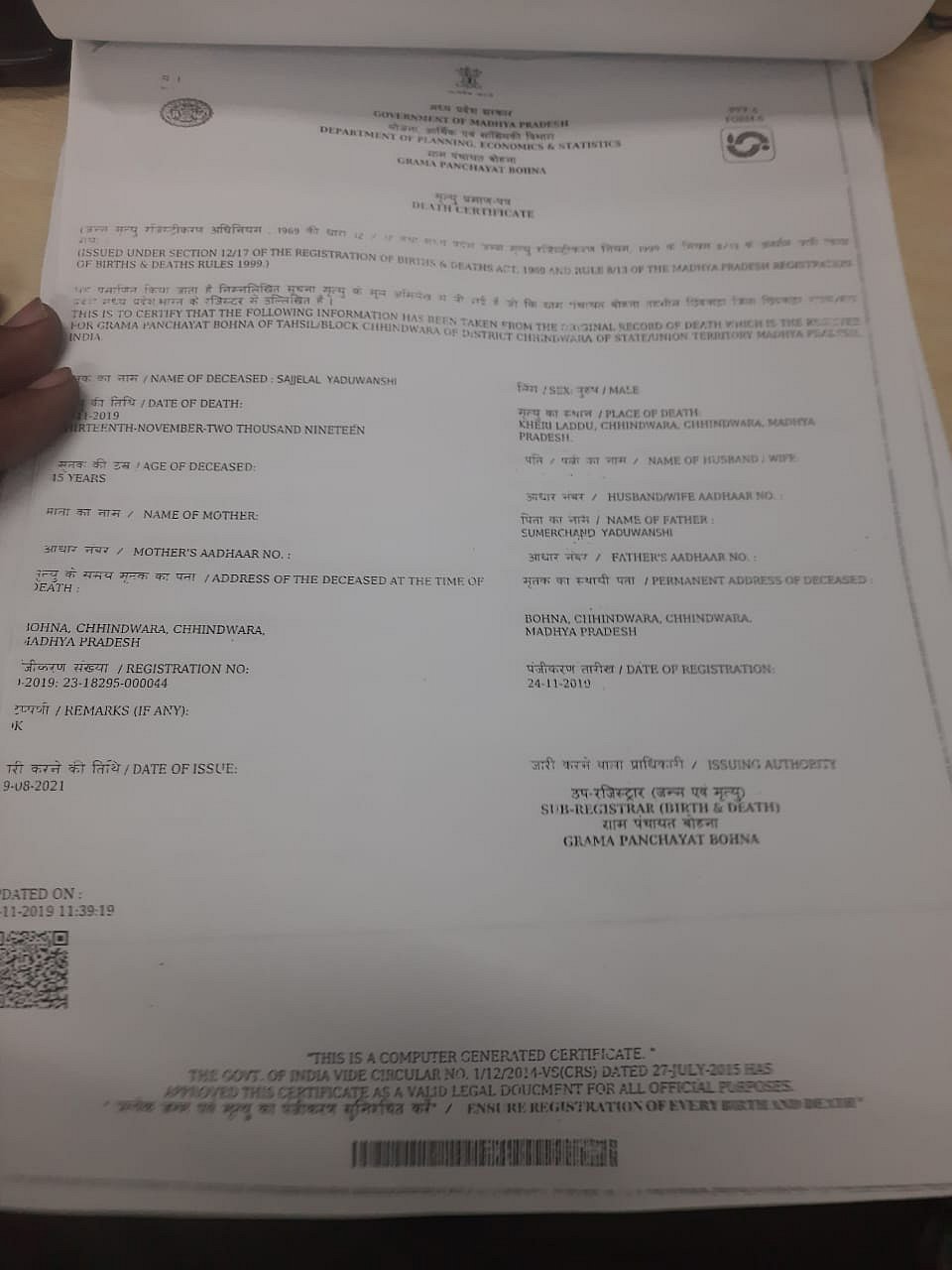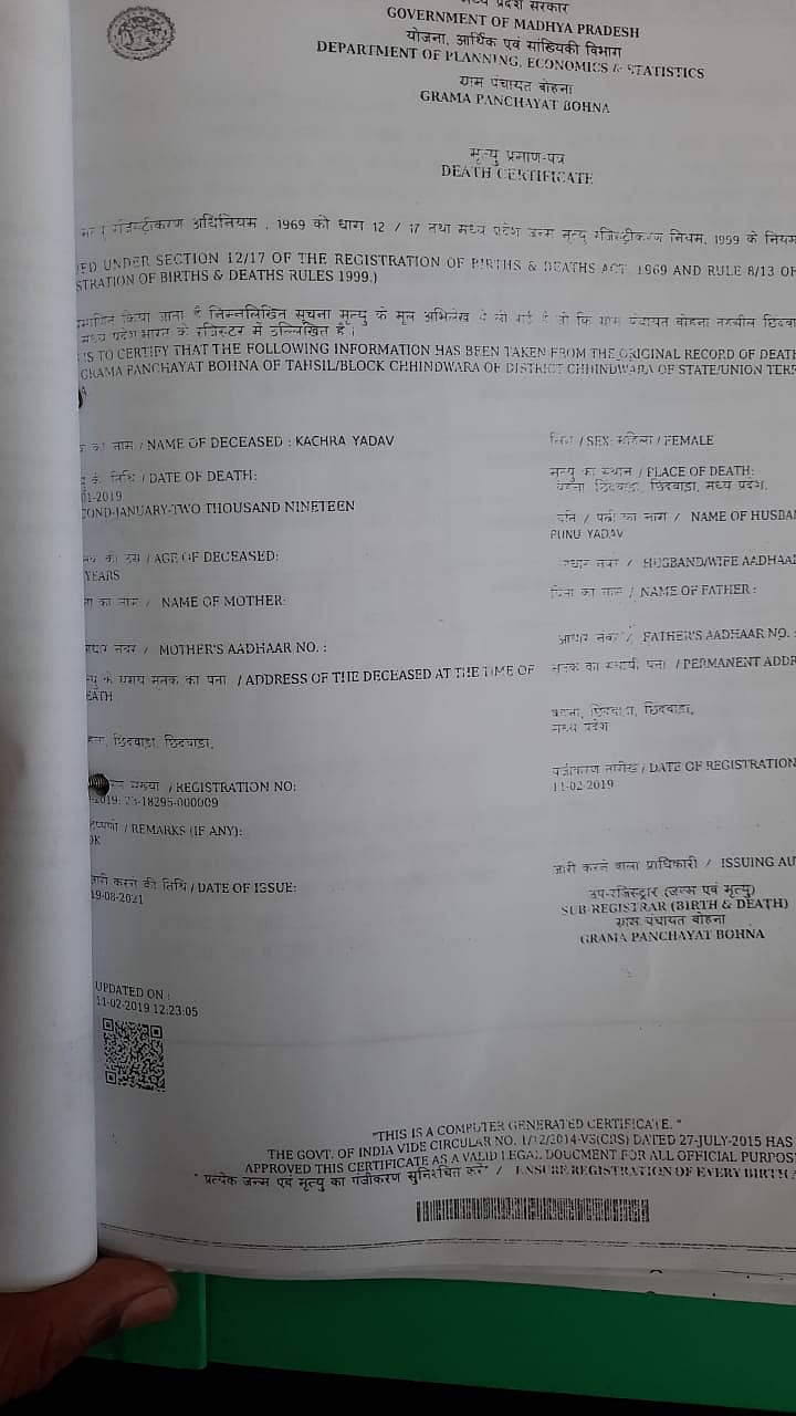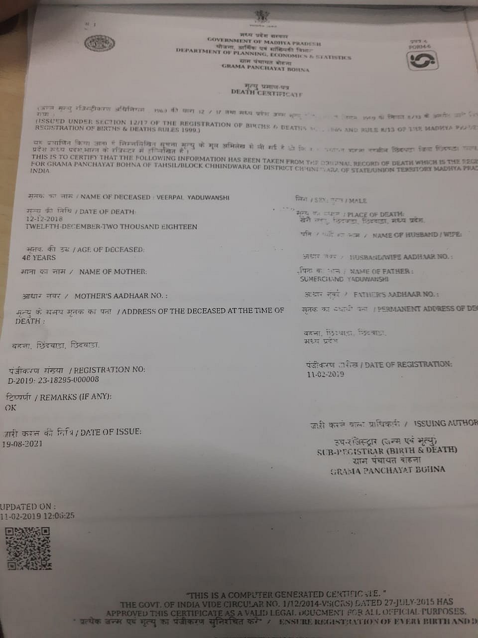यह मामला मध्यप्रदेश के छिंदवाड़ा जिले के बोहनाखैरी गांव का है. करीब 2700 जनसंख्या वाले इस गांव में 23 जिंदा लोगों को मृत बताया गया है. गांव के 26 साल के एक युवक नाम ना छापने की शर्त पर बताते हैं, “जब हमें पता चला कि सतीश की मां को मृत बताकर सरकार से पैसा ले लिया गया है. उसके बाद हमने साल 2019 से अभी तक गांव के मृत लोगों की लिस्ट पंचायत से निकलवाई जिनका मृत्यु प्रमाण पत्र बना है. इस सूची में दो सालों के दौरान कुल 106 लोगों का मृत्यु प्रमाण पत्र जारी हुआ जिसमें से 23 लोग अभी जिंदा है.”