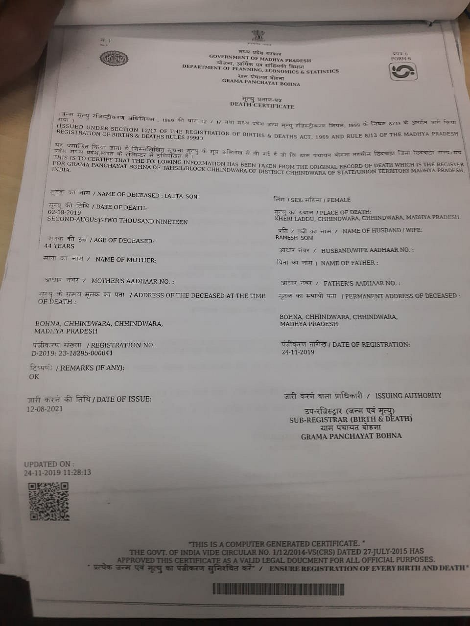 ललिता सोनी के मृत्यु सर्टिफिकेट में 2 अगस्त 2019, पंजीकरण की तारीख 24 नंबवर 2019 और सर्टिफिकेट जारी होने की तारीख 12 अगस्त 2021 लिखी हुई है.