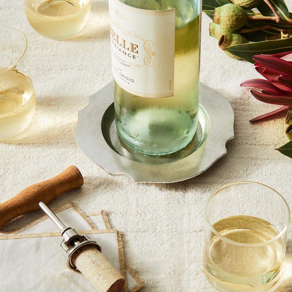 A sweating wine bottle can leave a discolored ring on a wooden table, which is where this wine coaster comes in handy. The beautiful handmade pewter disc is the perfect size to rest a bottle of wine, and it has cork on the bottom to prevent any scratches on the surface below. Its curved edges make it an attractive piece to display on the table, and it will last a lifetime if cared for properly.