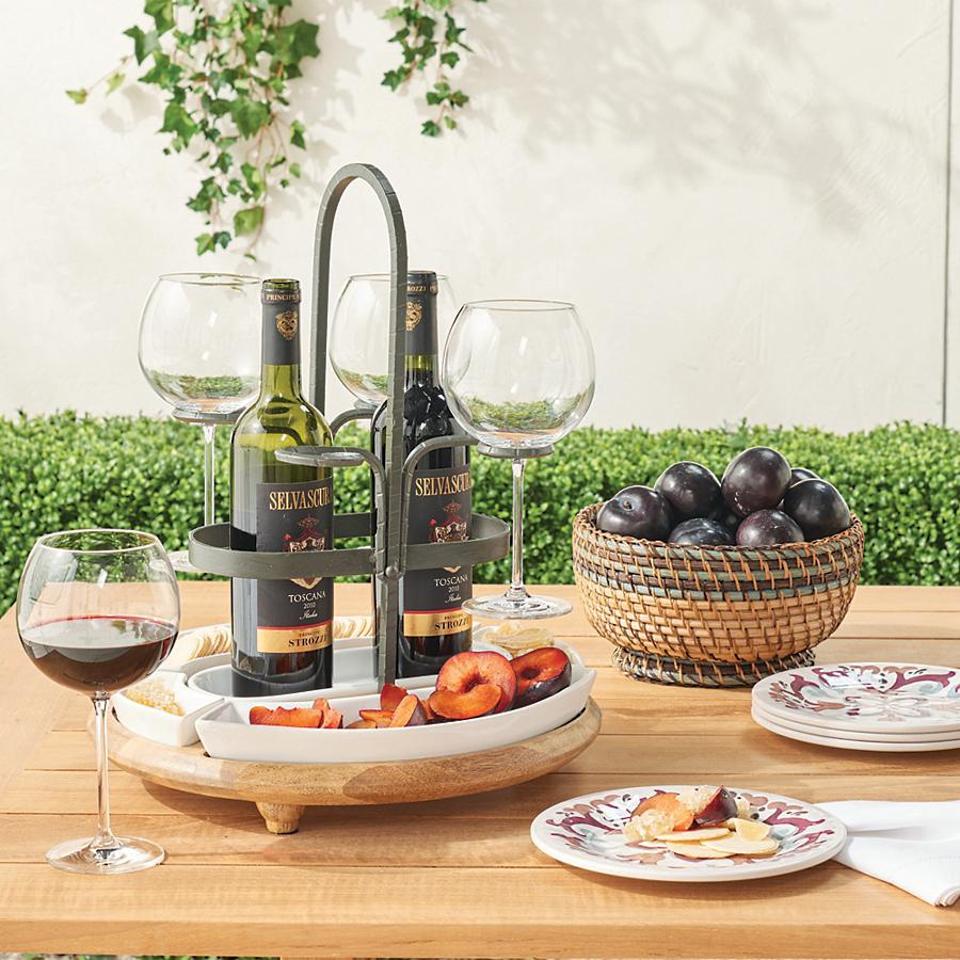 Perfect for holiday gatherings, this wine caddy has space for two bottles of wine and four stemmed wine glasses, and it comes with four ceramic dishes that can be used to serve cheese, crackers and other snacks. The design is crafted from mango wood and wrought iron and it comes with a removable second tier in case you want to use it solely as a serving tray.