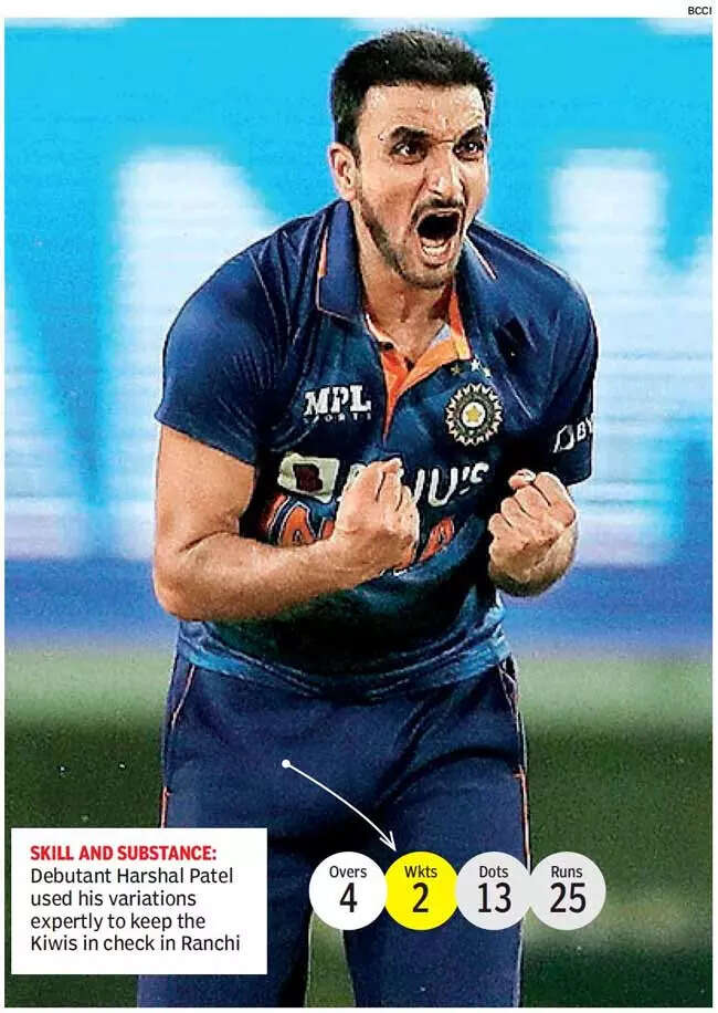 RANCHI: Soon after winning his second consecutive toss, India's T20 captain Rohit Sharma didn't have any hesitation in asking New Zealand to bat. At a venue where dew starts falling quite early after sunset, that was a wise and automatic choice. Rohit was helped by his bowlers, who made a superb comeback after the Powerplay to restrict New Zealand to a modest total. Debutant Harshal Patel being the pick of the pack.