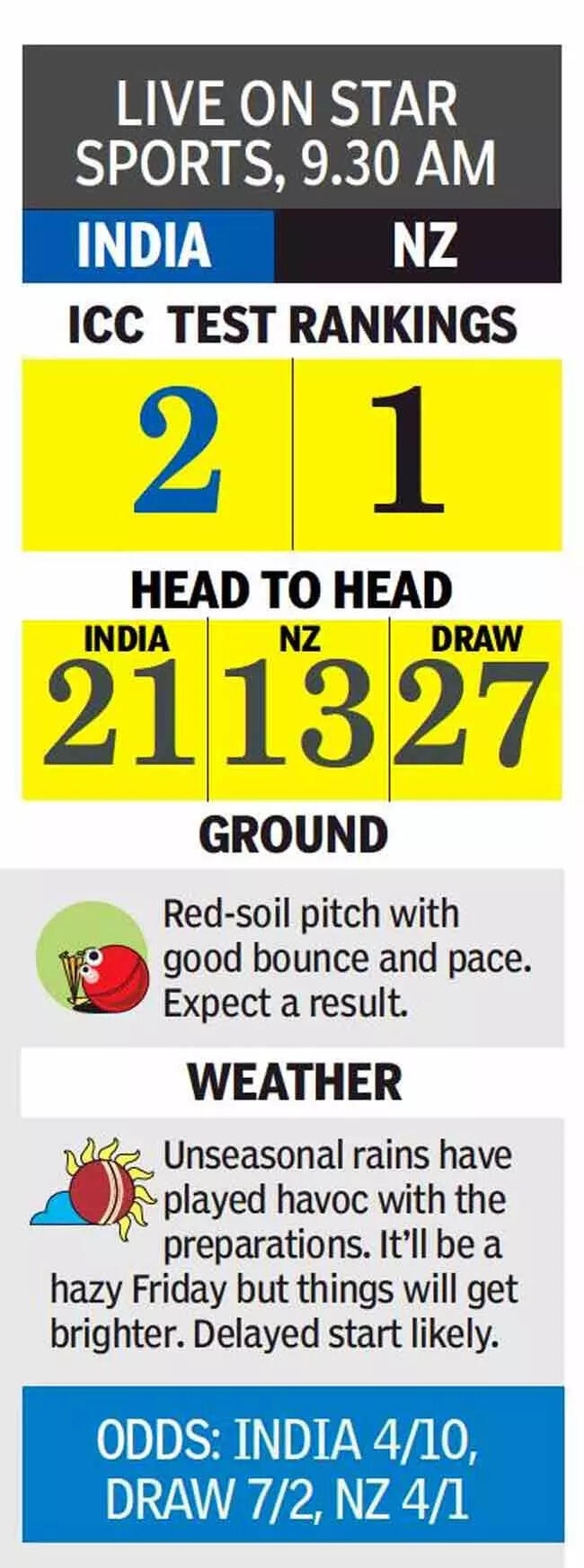 Thankfully for cricket fans, bright weather is predicted from Friday, the first day of the Test. Still, the wet and cloudy conditions in Mumbai at present would make the Kiwis feel more at home - it's as if they're in Christchurch or Wellington, than in a city known for its heat and humidity. Regardless of the state of the wicket, this environment should favour their fabulous fast bowling trio of Tim Southee, Kyle Jamieson and Neil Wagner - all three, particularly Southee can swing the ball well, while Jamieson and Wagner should enjoy the generous bounce on offer.