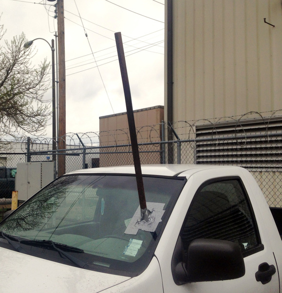 He said a pipe or pole flew from the Loy-Lange Box Co. building across a parking lot and went through the windshield of his pickup. The pipe was sticking straight out of his windshield.