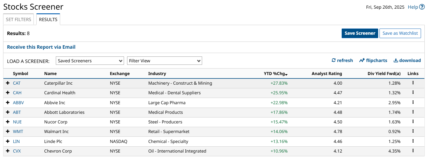 - Current Analyst Ratings: 4 (Moderate Buy) to 5 (Strong Buy). With this filter, I’ll only get Dividend Aristocrats that are well-liked on Wall Street. To be clear, high analyst scores are not a 100% predictor of future performance, but it’s always a good sign when Wall Street is bullish on these companies.