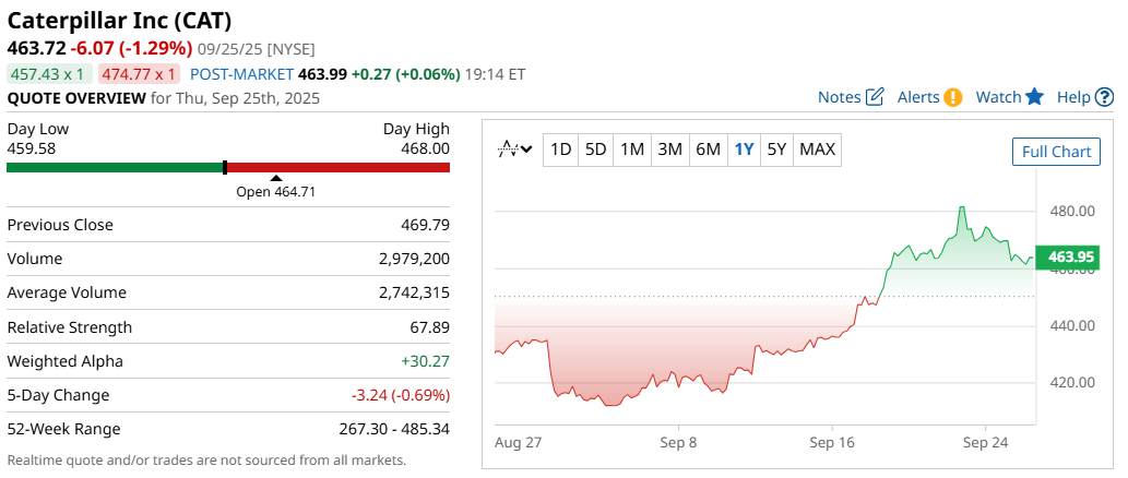 Today, Caterpillar pays $1.51 quarterly, which works out to $6.04 annually, or approximately a forward 1.3% yield. The company also increased its payout in June 2025, marking its 31st consecutive year of dividend increases. CAT stock has grown 27.83% year-to-date, while a consensus among 21 analysts rates the stock a “Moderate Buy” with a flat 4.0 average score and a high target price of $540, which suggests 16% in potential upside.