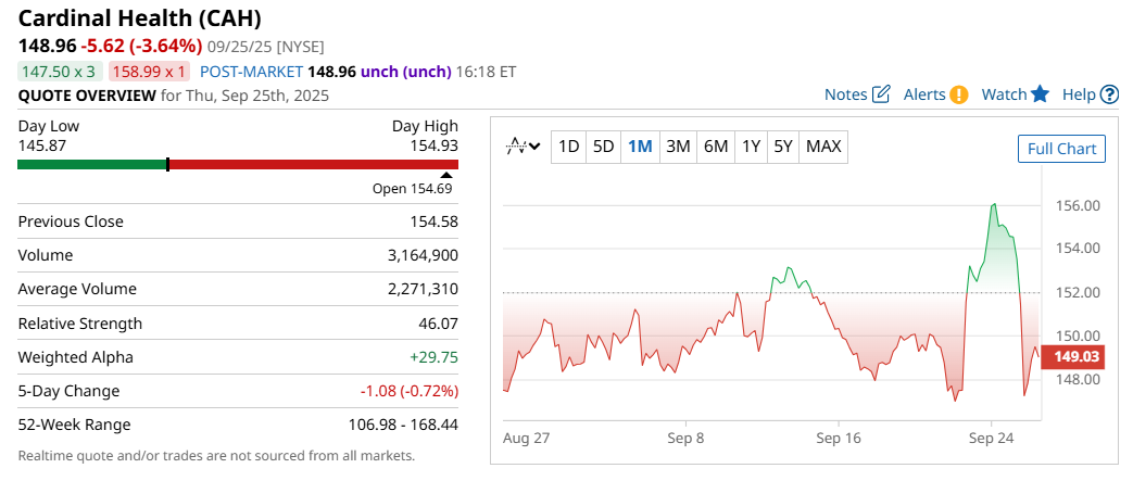 Next up is Cardinal Health, a health care services company. Cardinal Health operates two segments. The first is Pharmaceuticals, which includes the manufacture and distribution of branded, generic, and specialty drugs, as well as healthcare systems, including radiopharmaceutical services and pharmacy support.
