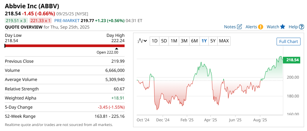 Today, AbbVie pays $6.56 per share in annual dividends, which translates to approximately a 3% forward yield. ABBV stock has also grown 22.98% year-to-date.