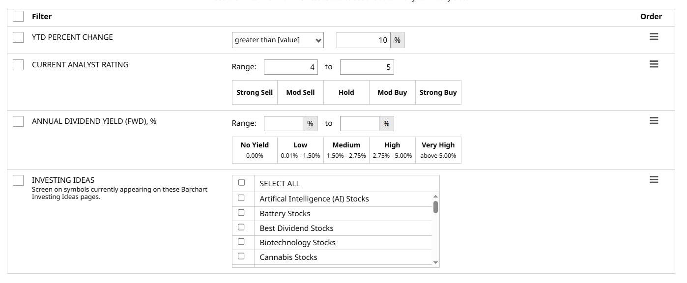- YTD Percentage Change: 10% or more. This simple filter limits the results to stocks that have grown 10% or more year to date.