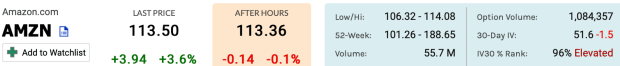 Notice that Amazon’s 30-Day IV (its average IV reading over a 30-day period) is 51.6 — less than half that of AMC’s 115.8. So Amazon has lower volatility, right? On a literal basis, sure. But from the perspective of historical averages (using IV rank), Amazon’s IV is currently higher than it has been 96% of the past year. That’s pretty high. Comparatively, AMC’s IV rank is just 29% — meaning the IV has been higher 71% of the time over the past year!