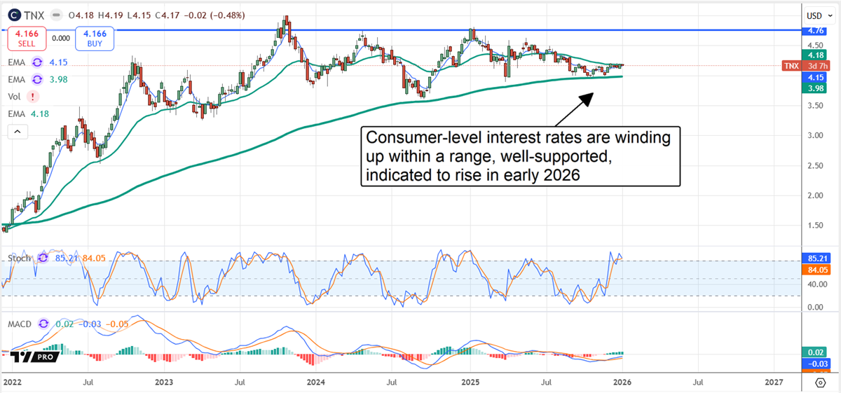 The most current data, as of early January, are initial jobless claims, which indicate a labor market trending steadily within a healthy range and showing signs of improvement at year’s end. The takeaway, as reflected in the CME Fedwatch Data, is that interest rates are only expected to fall slightly in 2026. The estimates could be optimistic, assuming the AI investment cycle continues to gain momentum, and the anticipated tailwinds from legislative change take effect. Looking at this chart, there is more risk that consumer-level interest rates will increase as the year progresses than decrease.