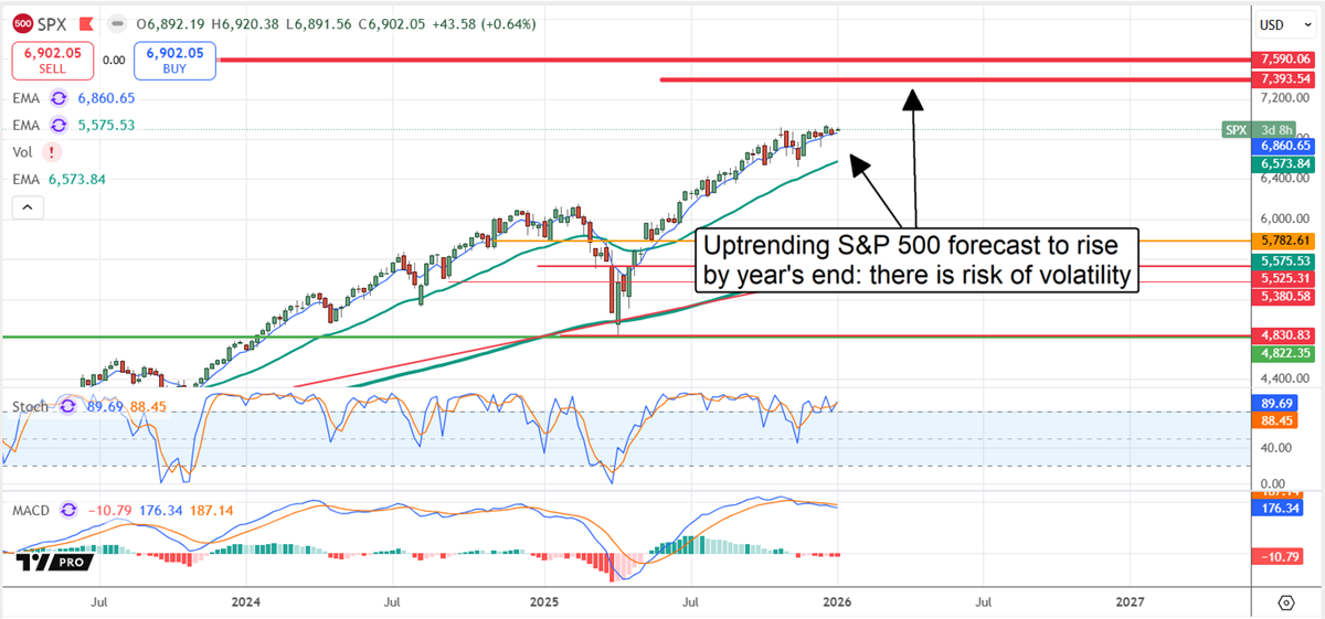 The S&P 500 rallied in 2025 and is likely to extend the gains in 2026. The average estimate is a move to the 7,500 region, while the high end runs above 8,000, a more than 15% upside driven by earnings growth and capital returns. Earnings growth is the primary driver, as the outlook includes sustained growth for the current and subsequent three quarters, growth accelerating sequentially, and estimates have been rising. In this environment, the index can continue rallying indefinitely, easily reaching the target range by mid-year.