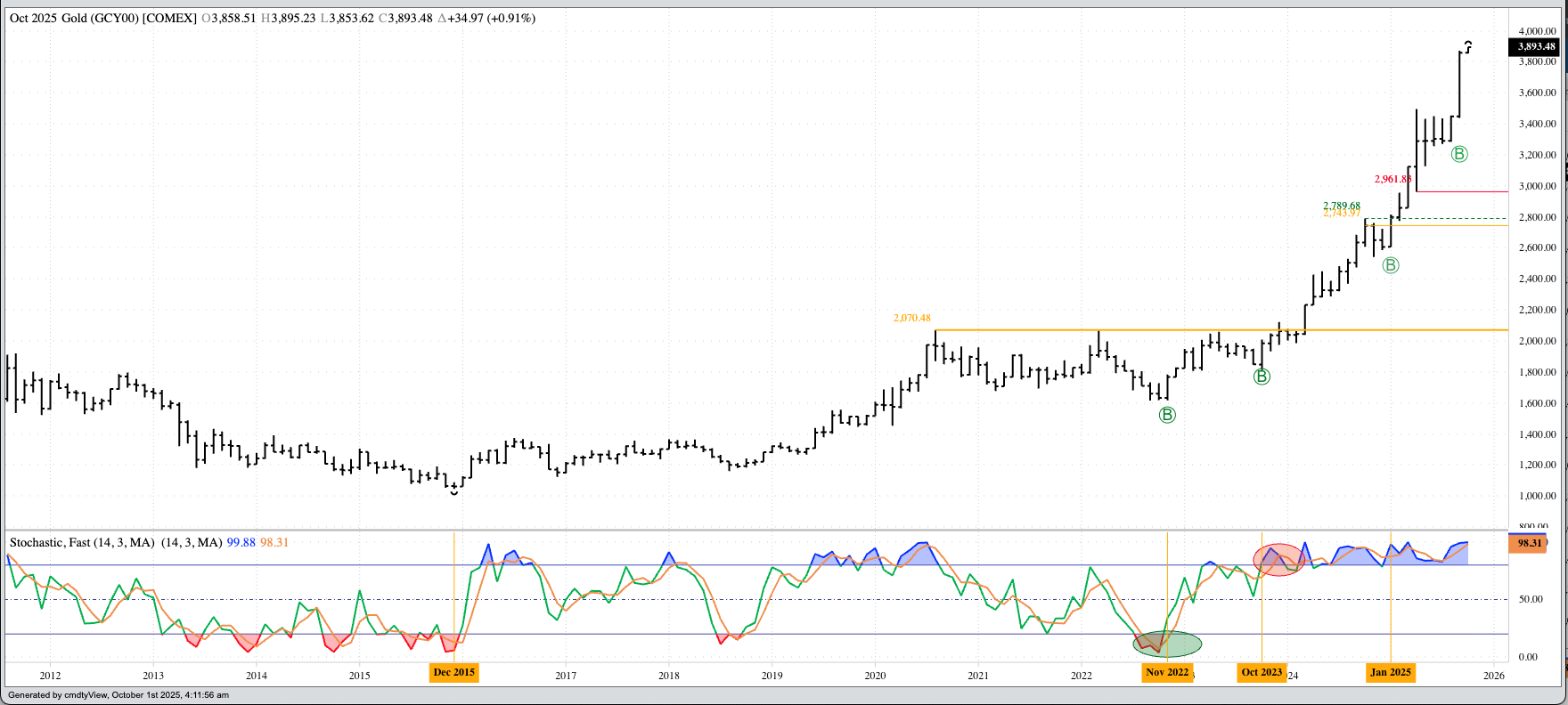 Reason #3: Consolidation of Power. Central banks and global investors long ago realized the Western World lost its leader over the past decade, the great experiment in representative democracy lasting fewer than 250 years. The political scientist in me – yes, that is what it says on the piece of paper I received upon graduation from good ol’ Fort Hays State University 4 decades ago – would argue the experiment never worked, but its failure was hidden by an intricately detailed façade. But this ‘artificial or deceptive front’ is gone, and we can see the US system for what it is. The current US president has openly stated he has no use for a 3-branch government, with any and all decisions coming from the executive office only. If you see the similarity between the real US system with those in place in Russia, China, and others cut from the same cloth, you aren’t alone. A look at the monthly chart for the Gold Index shows a gain of 42% since its October 2024 settlement of $2,743.97. And we know what happened in early November. It’s interesting to note the previous record run occurred between December 2015 and July 2020, including the US Presidential election of 2016.