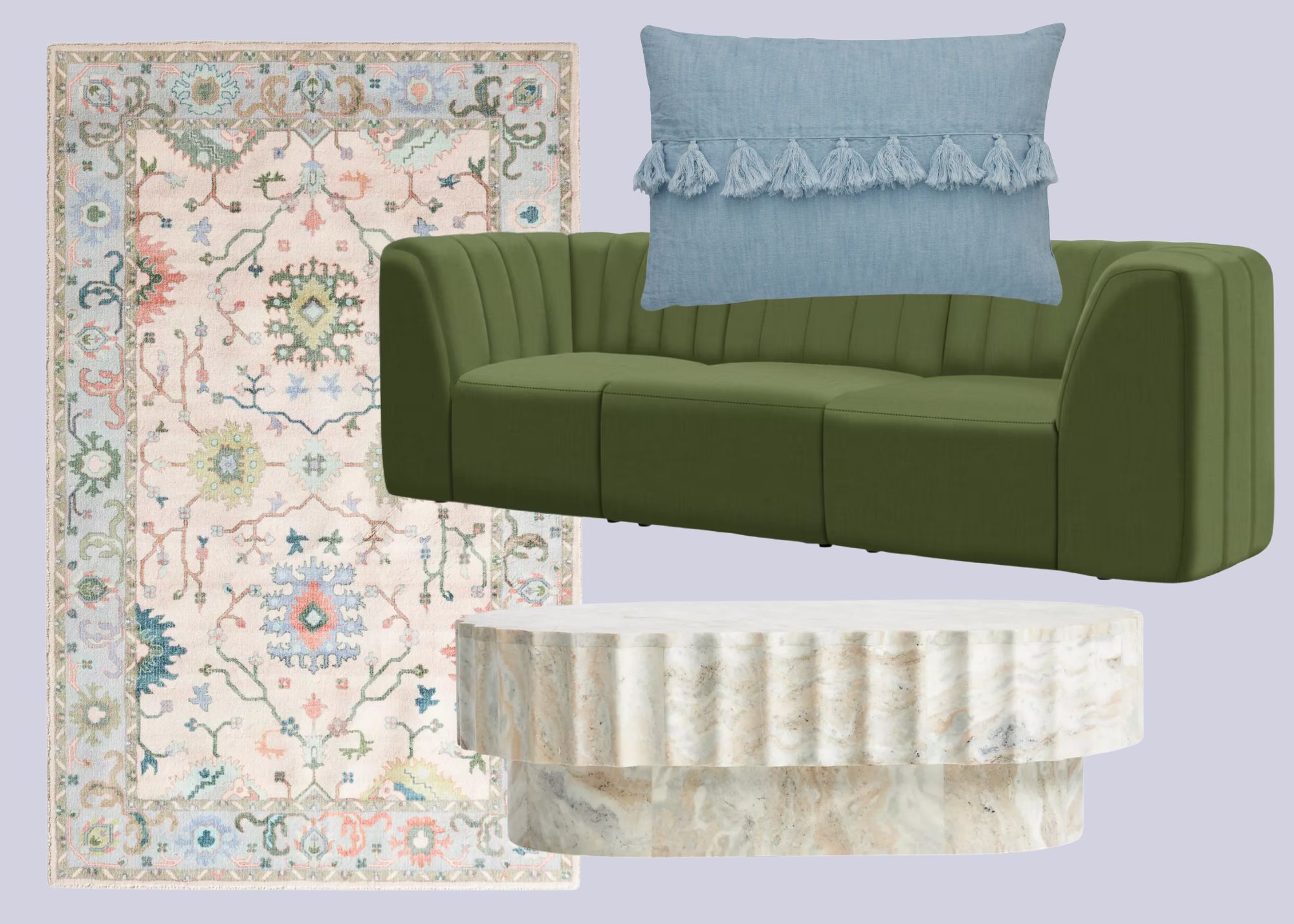 Her vision involves a floral-patterned rug, which acts as the foundation for her color palette. Add a blue-fringed throw pillow and a fluted marble coffee table, and you have a soft and refined space that really allows the sofa to shine.