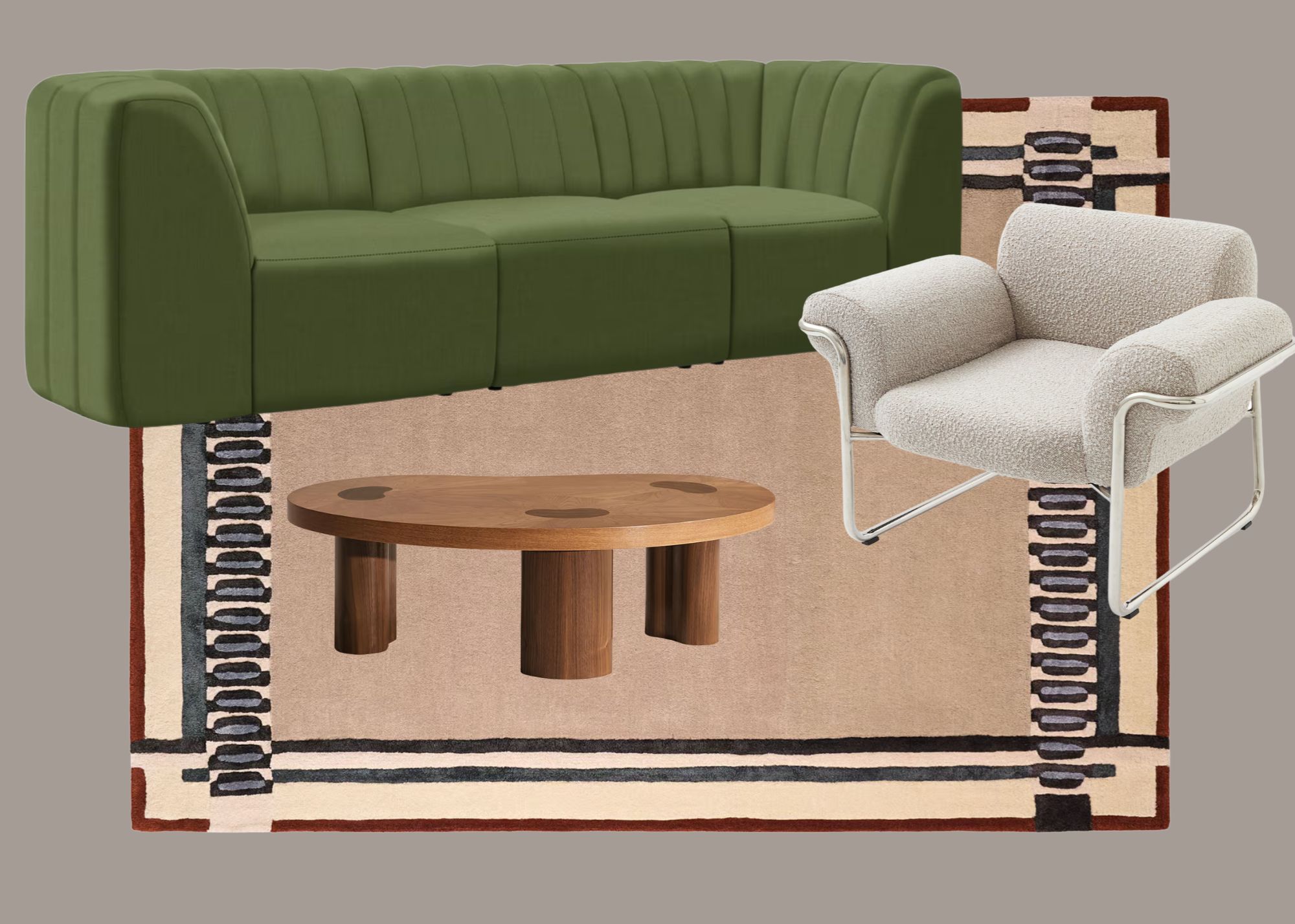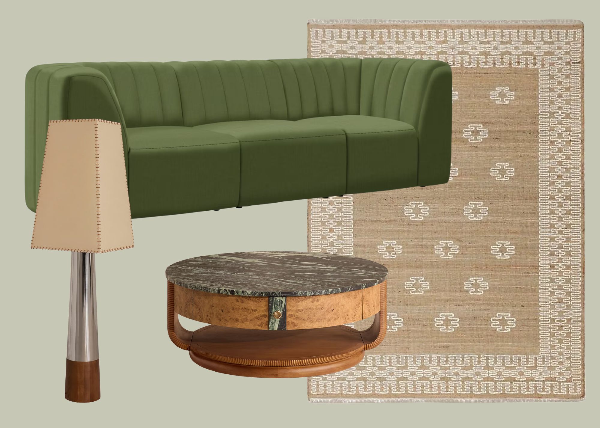 When your sofa is a block color, you can afford plenty of pattern and texture underfoot. "The soft neutral tones of this rug create cohesion between the olive upholstery, pulling everything together in a space that feels calm, layered, and timeless," Christopher adds.