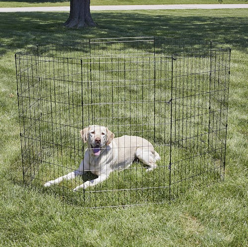 Owners of large dogs will love this foldable pet playpen, which — at 16 feet high — is specifically designed to accommodate your taller four-legged friend. When you buy, you'll receive four ground stakes and four thumb snaps, which are the only tools you'll need for an easy installation; when they're finished playing, you can simply take it down and fold it flat for a compact storage option that takes up barely any space. Its durable black paint withstands rust and weather for years to come, so it'll hold up even if your pet gets caught in the rain. It's also a great fit for other animals, from rabbits to guinea pigs.
