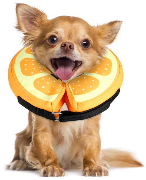 Nobody loves putting a cone on their dog, but it’s often medically necessary — especially if your dog just got out of an operation, or has hot spots. Try to make things better with this citrus cone that won’t completely block your dog’s vision, making it a little easier for them to adapt. It provides a cushion for your dog to keep them comfortable, is easy to clean, and looks adorable while it’s on. Plus, you can’t beat the price.