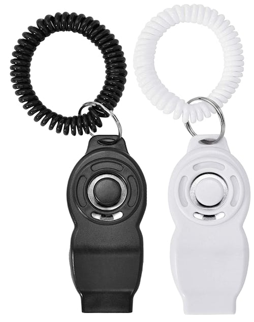 Got a pooch that loves to bark at everything in sight? Correcting them with your voice may not be the best way to get them to quiet down. “Common mistakes owners make when trying to fix this behavior include yelling at the dog or using physical punishment,” Patrik Holmboe, head veterinarian for Cooper Pet Care, tells Bustle. “These methods can actually make the barking worse, as the dog may interpret the yelling as joining in or the physical punishment as a form of attention.” Instead, use positive reinforcement training to correct behavior. This dog training clicker can teach your dog an “enough” command and reward them when they stop barking. They’re cheap, effective, and come with two in a pack.