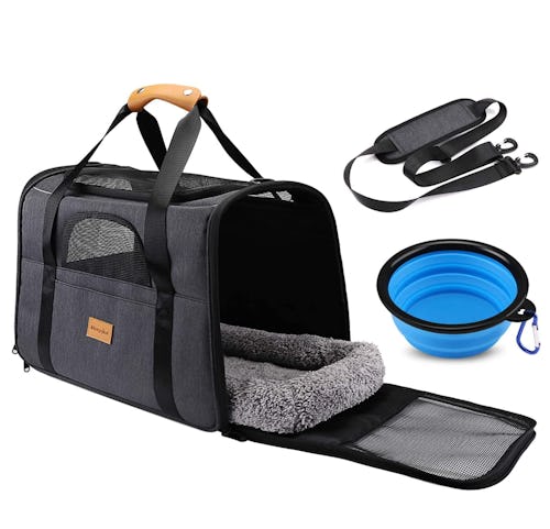 Creating a safe, quiet space for your dog — and teaching them to retreat to that space when they’re anxious or scared — is an essential part of training. Without that safe space, your dog might act out when feeling overwhelmed or stressed. “Find a quiet room in your home where you can put a pet carrier, but do not close them in the carrier,” Gayle Martz, animal advocate and founder of the Sherpa Pet Trading Company, tells Bustle. This dog carrier is ideal for bringing that safe space with you while traveling — it works for pets up to 15 pounds and it comes with a foldable food bowl and cushion. “When it is at home, I recommend letting your pet go to and from the carrier as they choose and leave them treats or toys that are always in the carrier for them,” Martz says.
