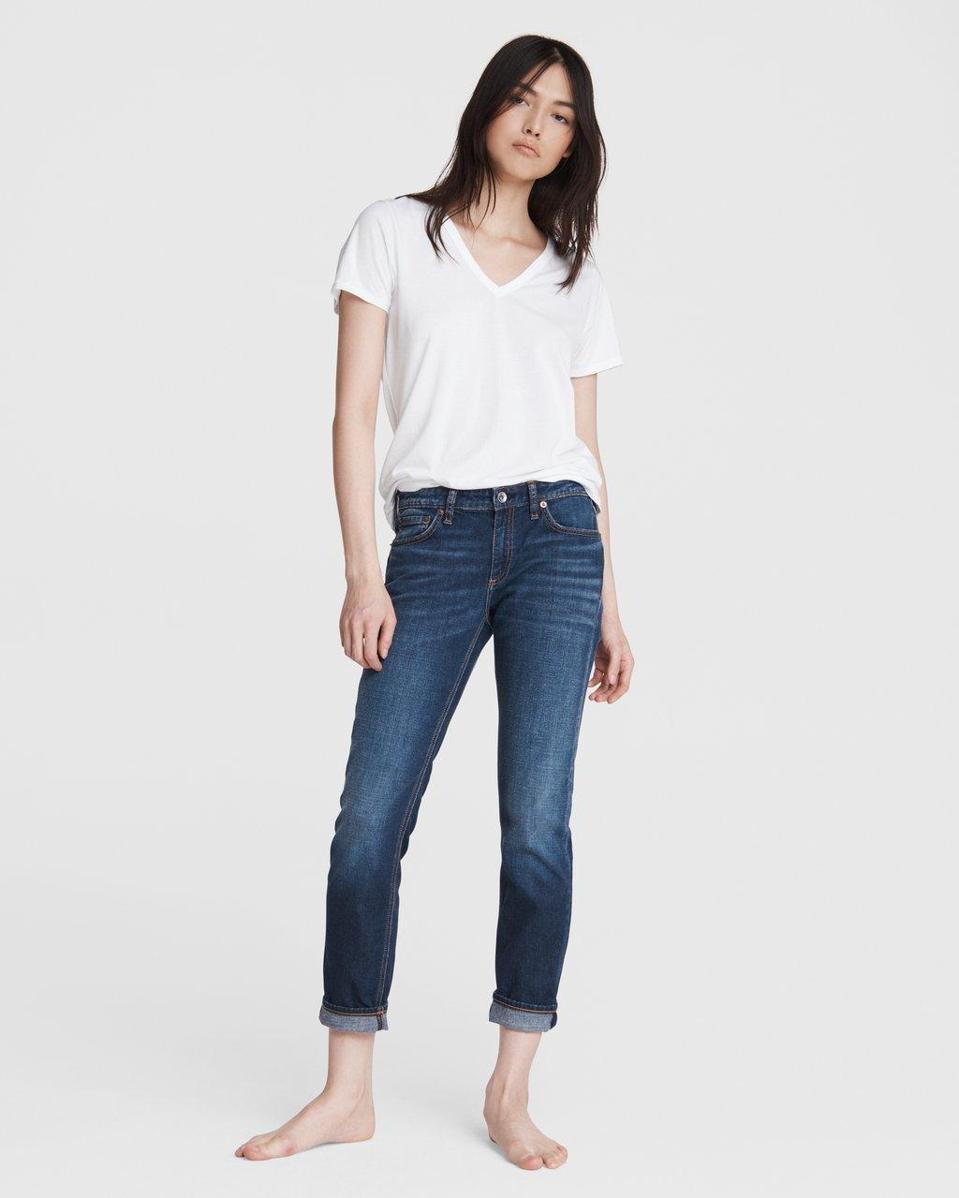 Rag & Bone has perfected that tomboy-chic vibe in denim. This pair of Low-Rise Boyfriend jeans is relaxed through the hip and thigh with a straight cut leg and cuff-ready hem. The fabric has some give to it and comes in a beautiful deep indigo rinse.