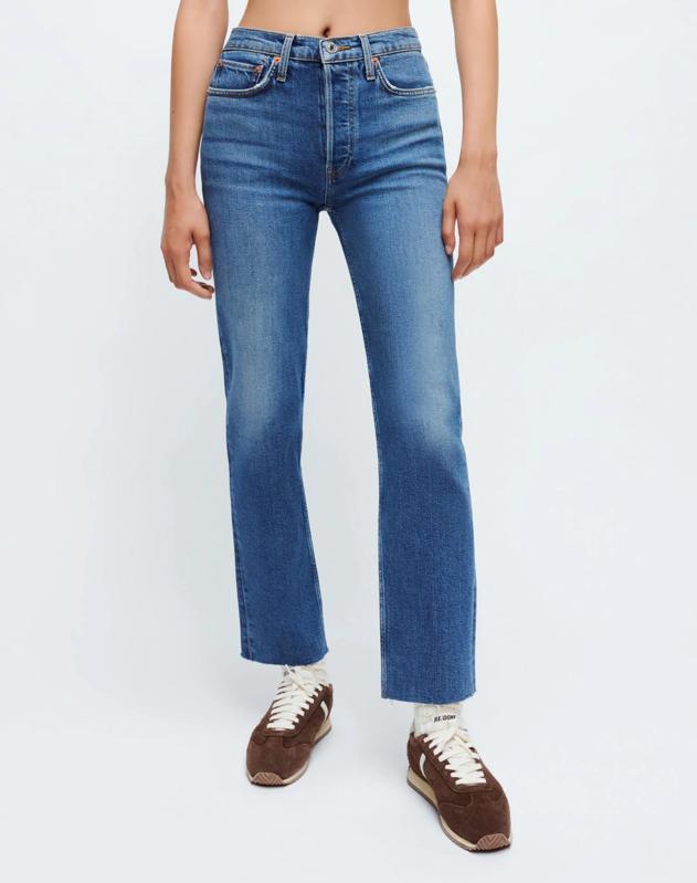 L.A.-based Re/Done launched with a unique concept—upcycling vintage Levi’s into modern styles, giving preloved raw goods a second life as collectables. The brand is especially strong in straight-leg silhouettes; this 70s Comfort Stretch High Rise has a classic 70s-inspired straight, stovepipe leg jean with with a faded wash and raw hem.