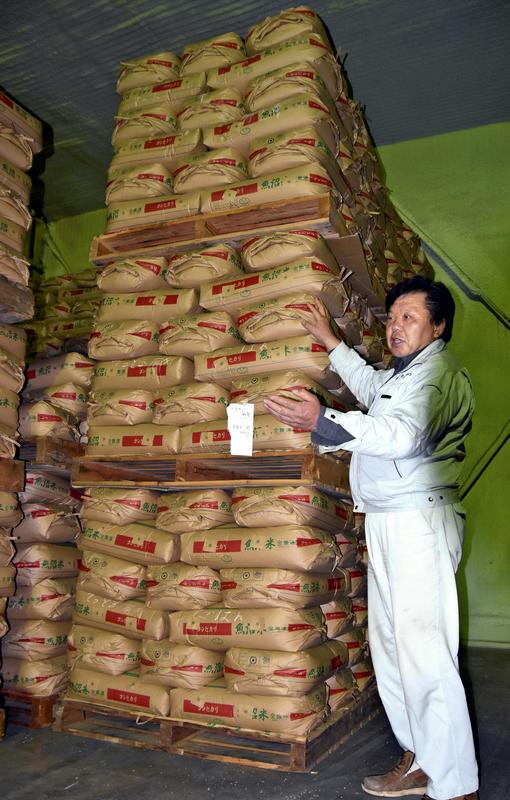 The Gohan Co. president stands next to bags of Koshihikari brand rice stored in the company's warehouse in Tsunan, Niigata Prefecture. (Credit: The Yomiuri Shimbun)