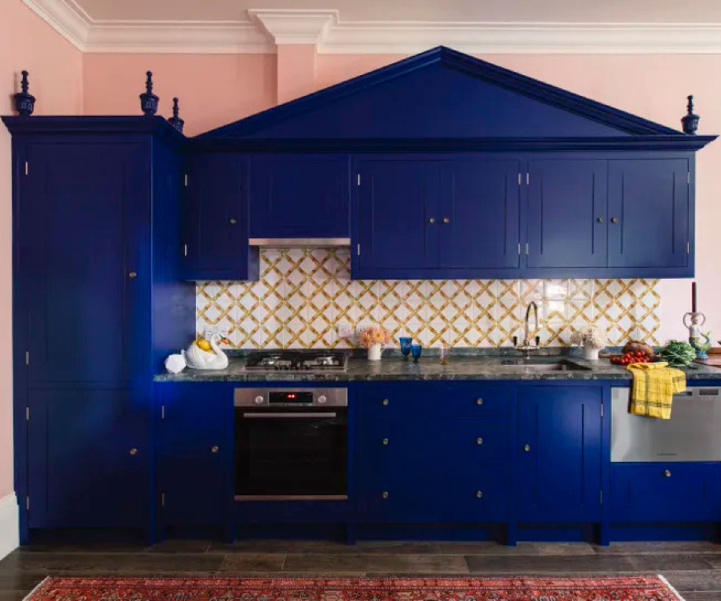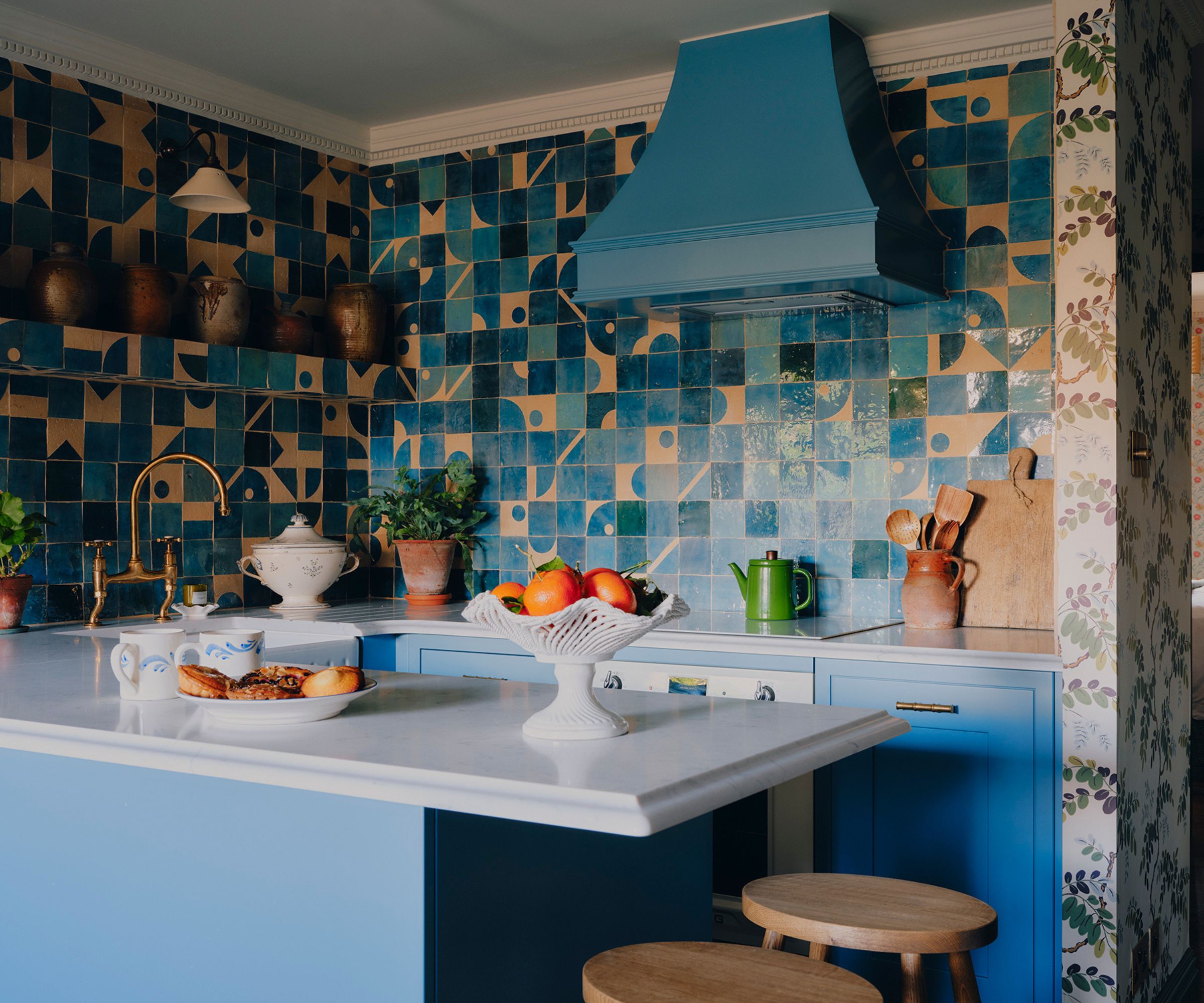 The kitchen in this tiny London apartment is anything but boring. The small proportions have been given the jewel box treatment, with cabinets and the range hood painted in Farrow & Ball Stone Blue, while a mix of pattern and plain zellige tiles in tonal shades on blue have been taken right to the ceiling to give the illusion of taller proportions, creating a bold, personality-filled design.