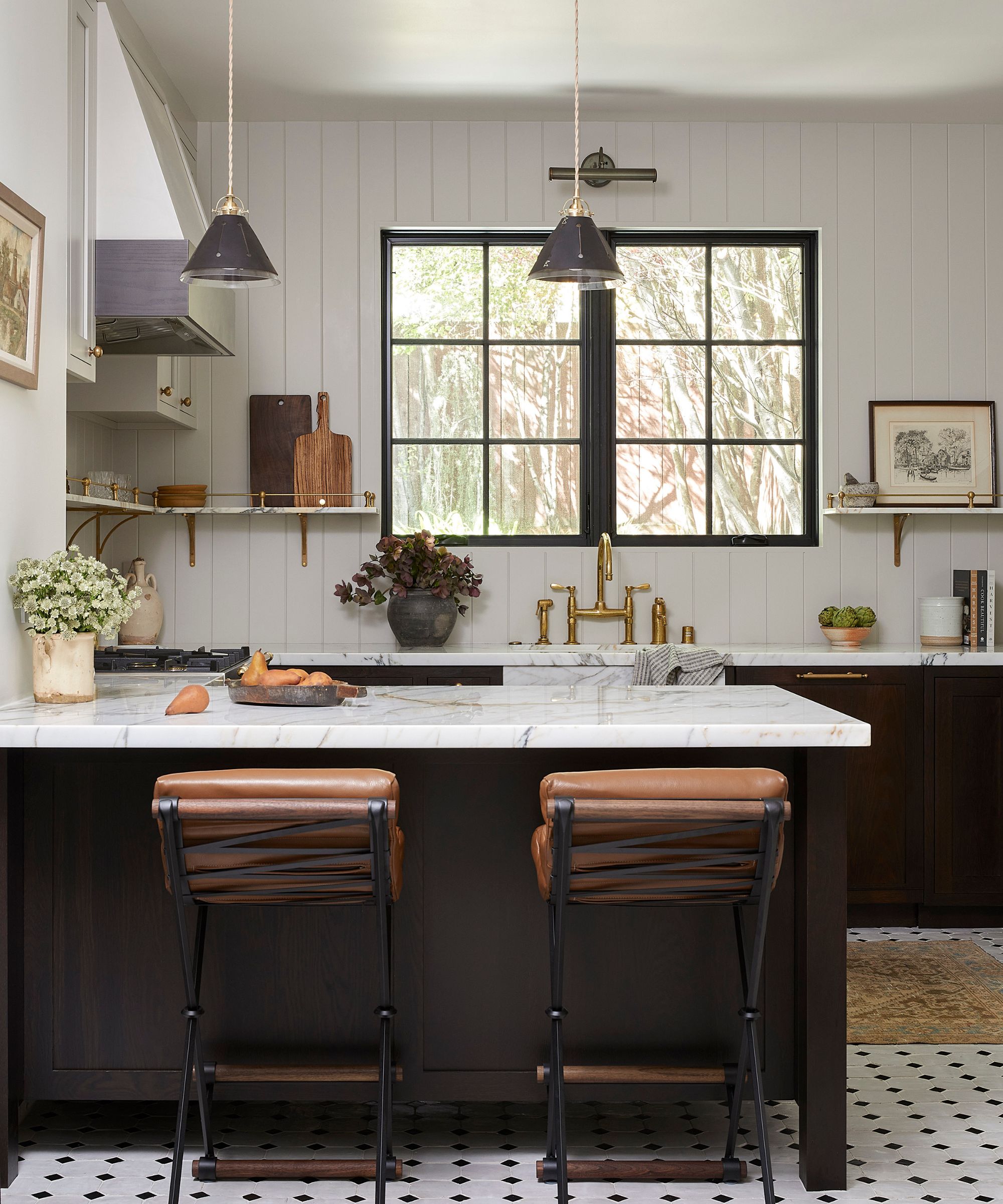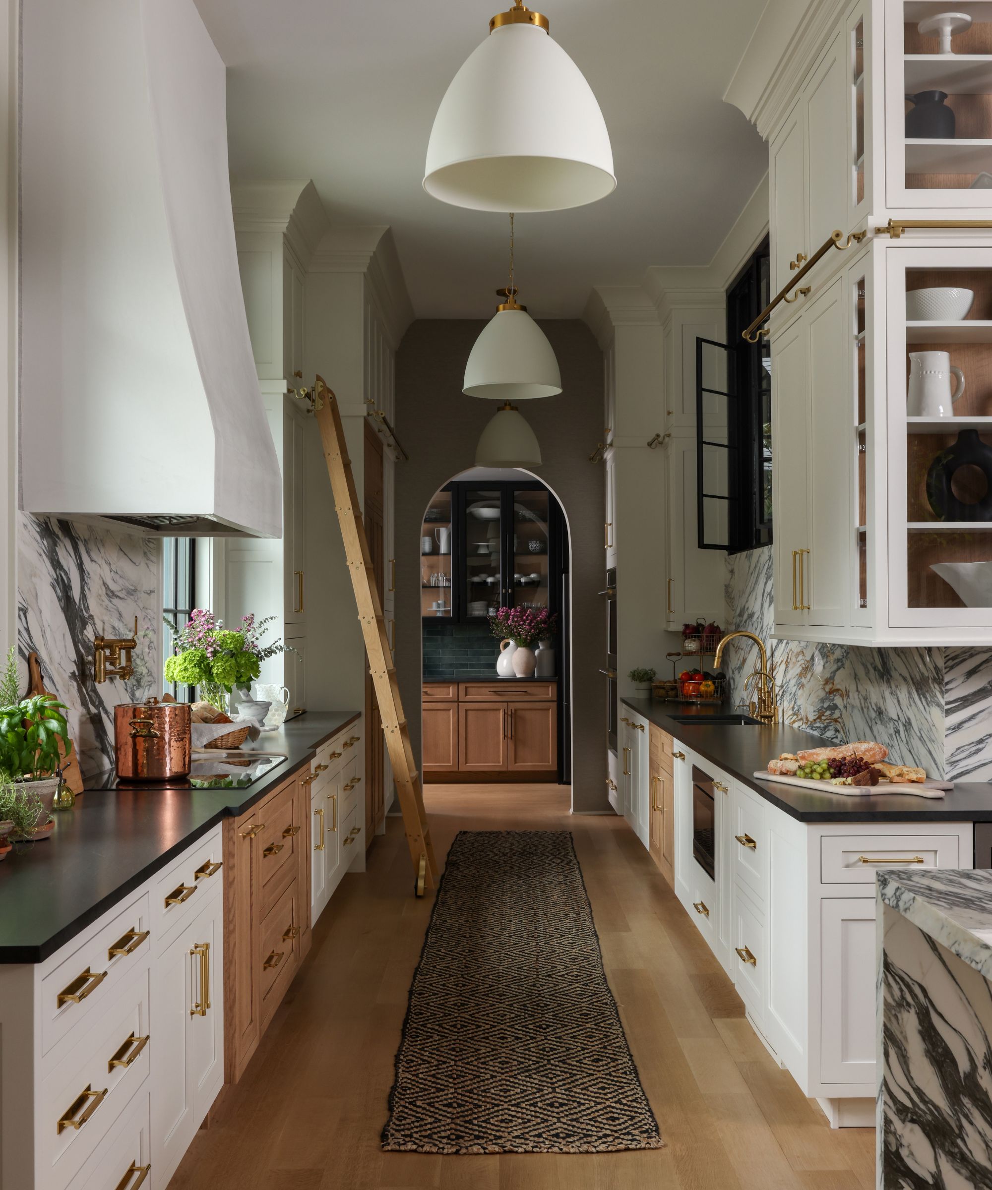 The kitchen in this renovated carriage house is long and narrow, yet features incredibly tall ceilings, so the designer endeavored to maximize the vertical space. 'We emphasized verticality by using full-height cabinetry, elongated pendant lights, and arched openings to draw the eye upward while keeping the palette light to enhance the sense of height and openness,' says Jamie Morgan, owner of Blake & Dane Interiors.