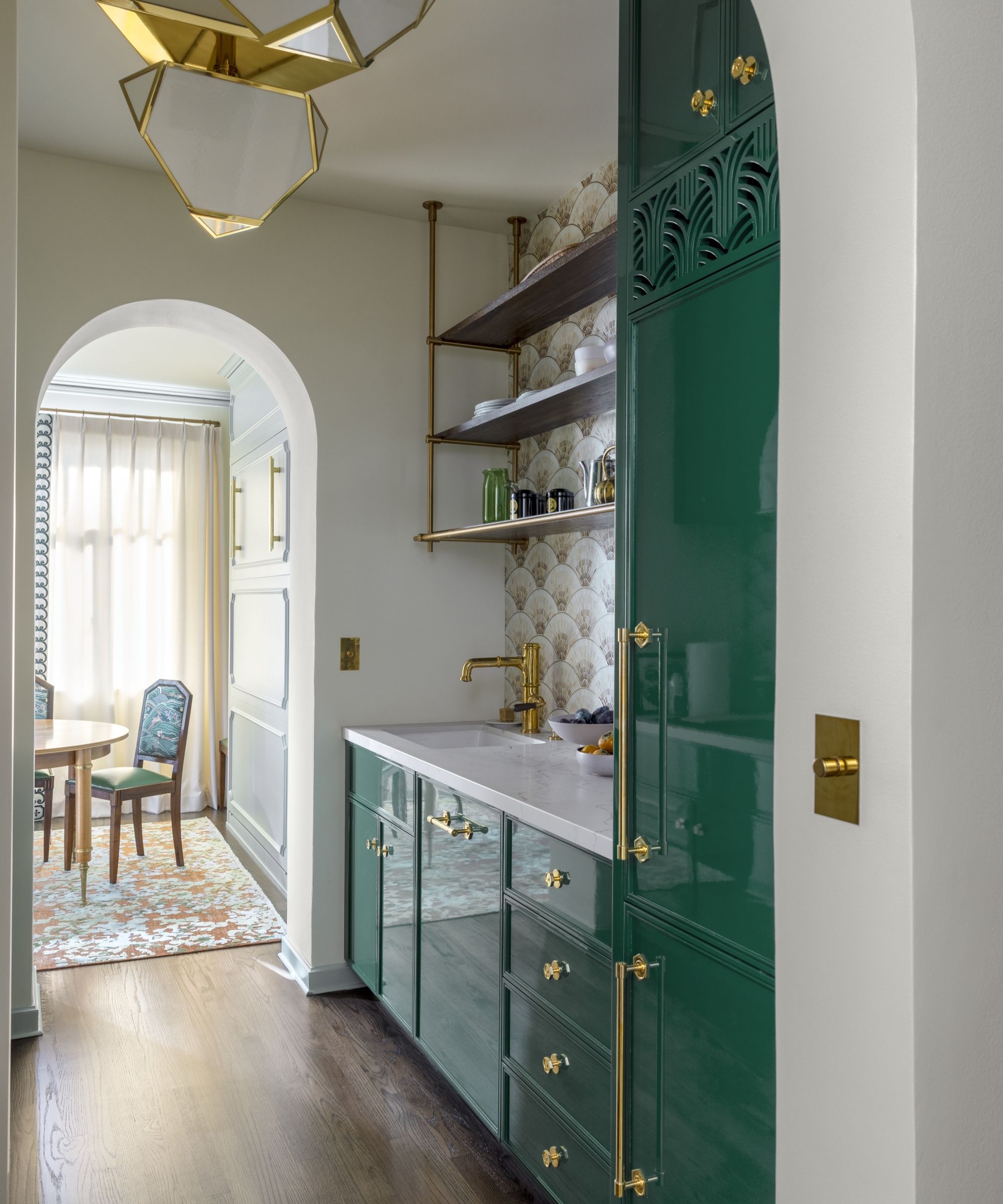 The awkward shape of this small kitchen meant the team at Copper Sky Design + Remodel needed to get smart and incredibly creative with the storage. To combat the curved walkway, staggered storage depths were created, leaving enough open space for dark wood-clad shelves and a hanging rail. It not only makes the most of an awkward area but also creates a striking design feature.