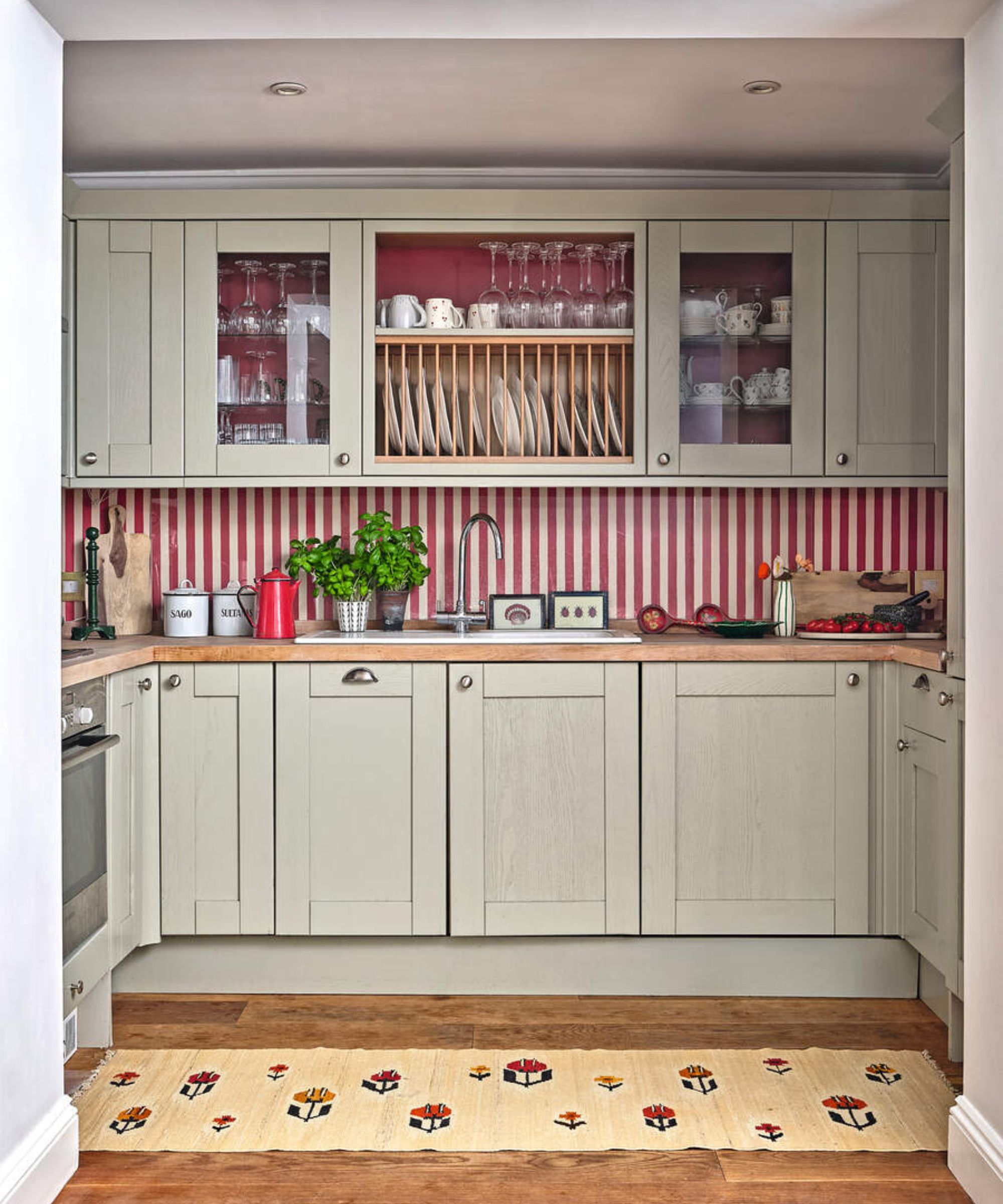 To add interest and a decorative detail to this alpine-inspired kitchen, designer Sarah Southwell opted for an unexpected wallpaper placement to create cohesion with the rest of the home. 'One of the key finishing touches was introducing the Alice Palmer red and white wallpaper, which we sealed with a Perspex layer to protect it and ensure durability. The backsplash has now become the standout feature of the kitchen, adding personality and a strong visual identity to the space.'